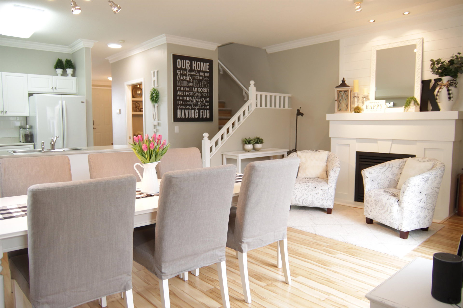 Welcome to Heritage Park Place. Uniquely styled, this stand-alone 2 storey home with basement has been lovingly cared for, attractively updated and ready to move into. With plenty of street parking right in front, you will be captivated with the gardens the moment you arrive. The main floor features large sitting room, open kitchen and eating area with a gathering spot by the fireplace to discuss the days events. Great access to the private backyard patio and the large double car garage. Upstairs you will find the 3 bedrooms and laundry. Downstairs has another bedroom, large rec room area and storage room. This home is air conditioned and 1/2 block to beautiful Heritage Park. Looking to downsize or to raise a family this is a great place to be. 2 dogs allowed.