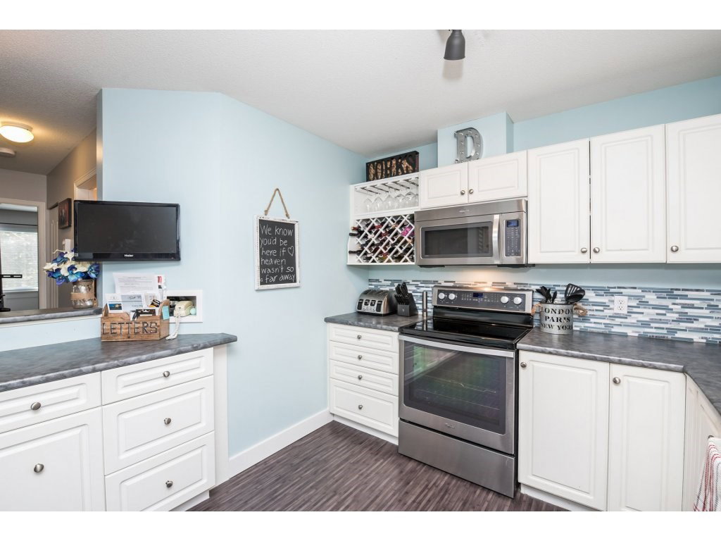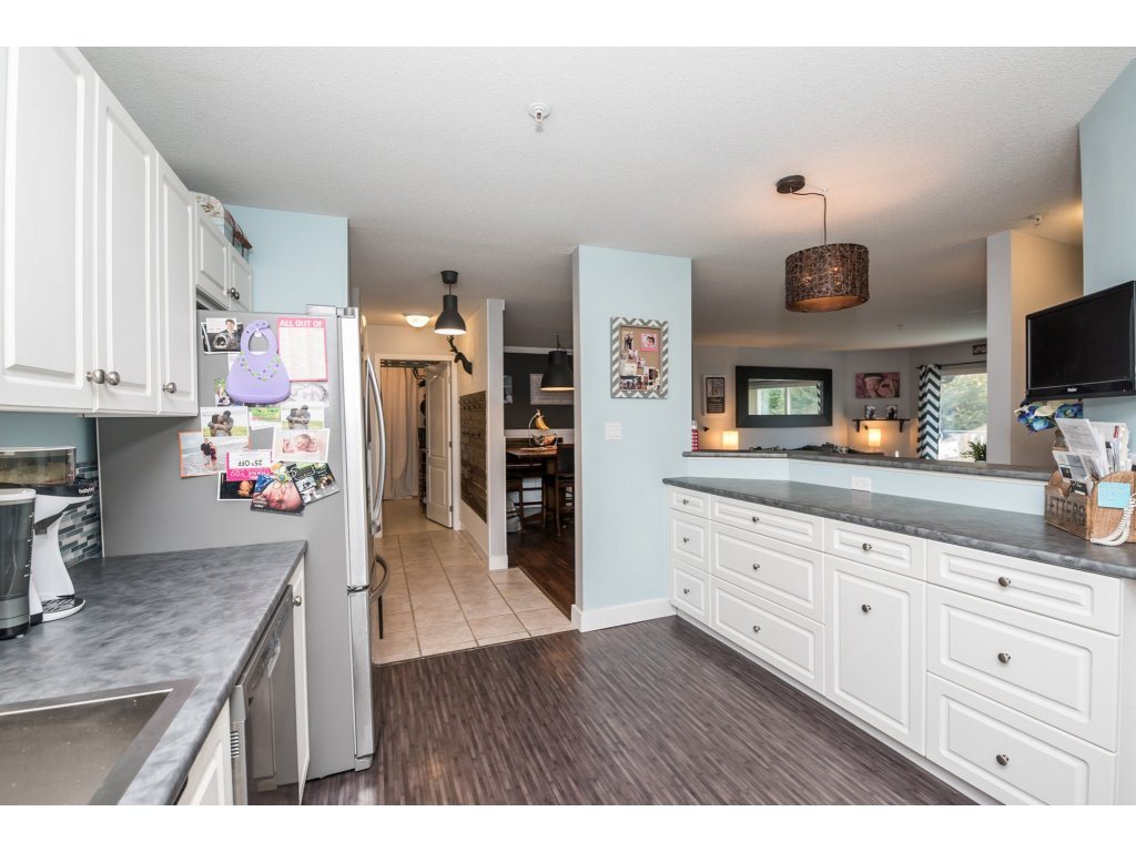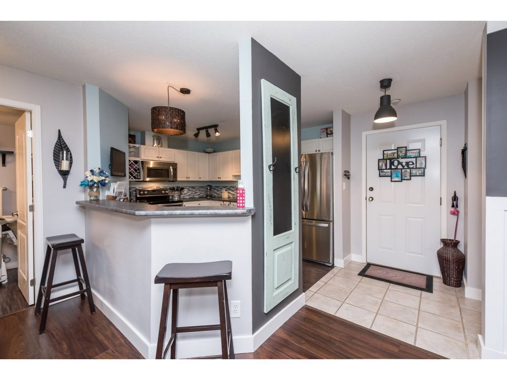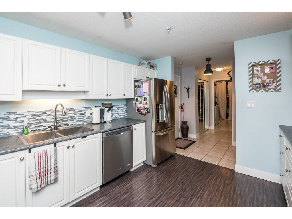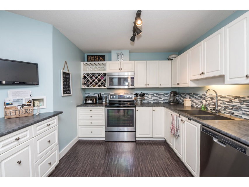 Best layout in College Park. 2 bed, 2 bath, 1122 sqft unit is wide and feels massive. Located at the back side of the complex, this home features 1 year old appliances, newer paint, flooring, counters, sinks, faucets, a grandfathered air conditioning, a massive laundry/storage room and 2 underground parking spaces. Built ins include a closet organizers in 2nd bedroom and entrance closets and a desk space in the living room. Space for a full size dining room table. Faux Brick wall in the master bedroom is a nice touch and has a brooklyn vibe. Roof is 8 yrs old, building plumbing upgrades have paid for by sellers already. Backs onto greenspace and is close to UFV, AESC, theater and has great highway access. Ready for you to move in!