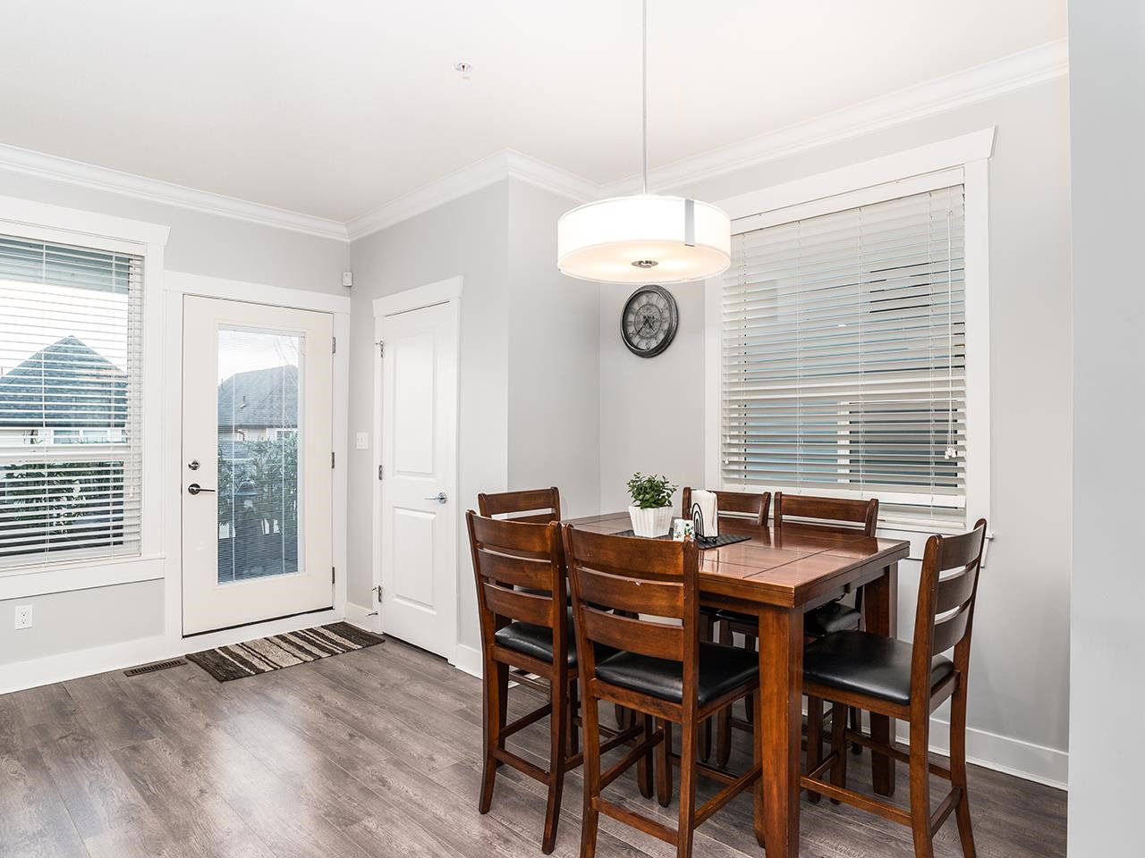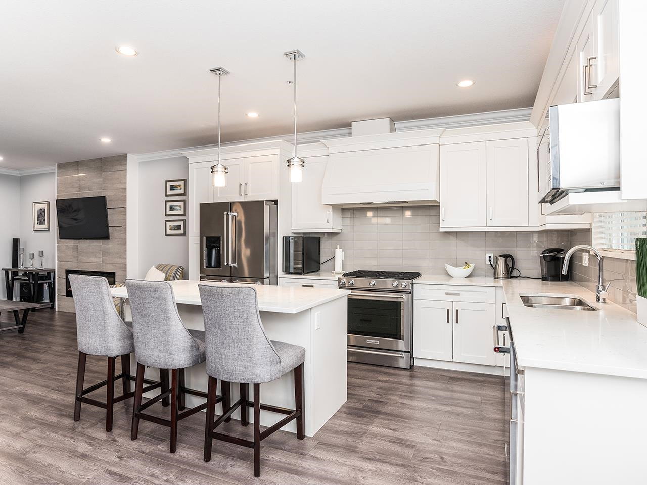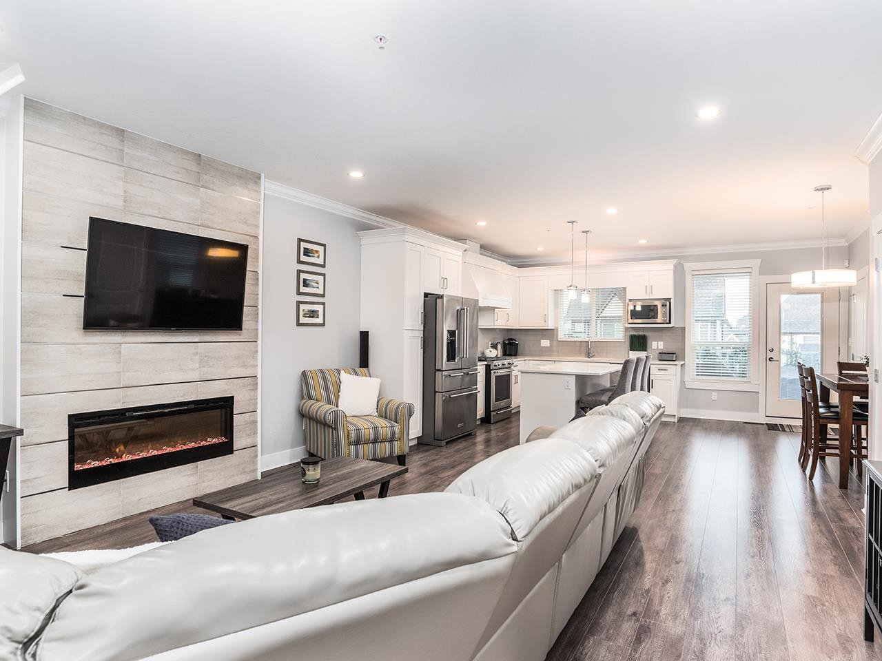 The Popular Ambiance Row Home (no strata fees). This Luxurious 4 bed 4 bath END unit offers an attached double garage plus 2 parking on pad. Open modern great room style with bright White cabinets, oversized island with Quartz counters. Upgraded stainless appliances, large pantry, spacious eating area. Great room offers 9 ft ceilings modern fireplace and Den/office. Finshed off with Laminate flooring and crown mouldings. 3 beds, laundry, open office area up. Master bedroom has vaulted ceiling, walk-in closet and spa like ensuite w/ soaker tub. Basement has Rec/Media room plus 4th bed and bath. Entertainers deck w/ Gas FP for cool evenings. Upscale features include garage floor coating, tankless hot water system, air conditioning, S.system. Just the perfect place to call home.