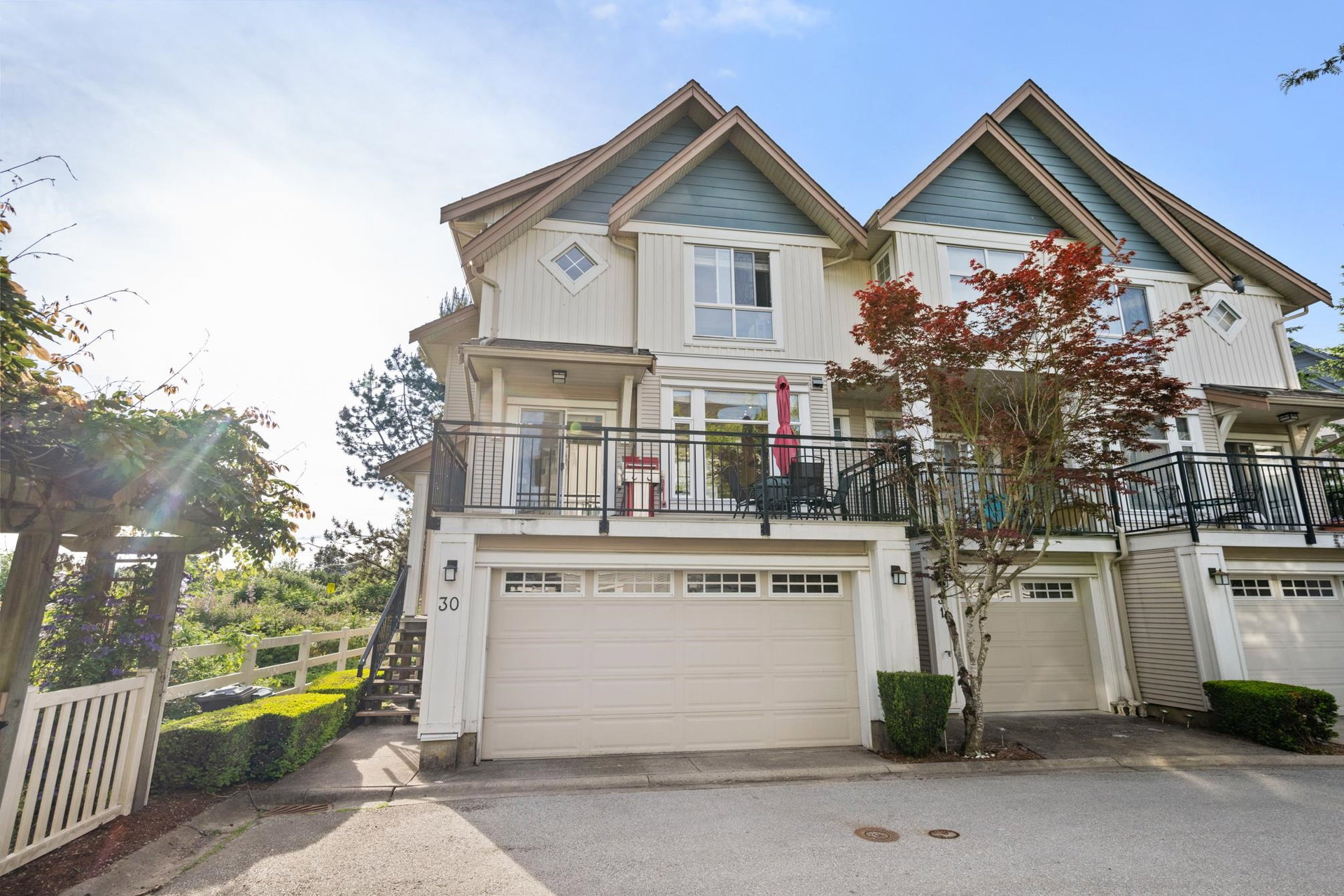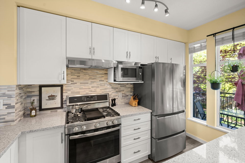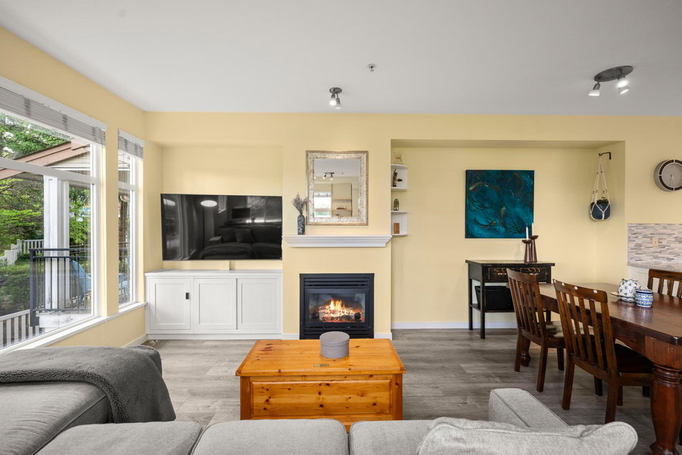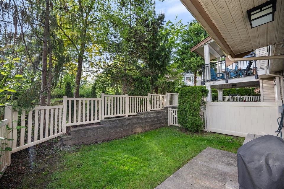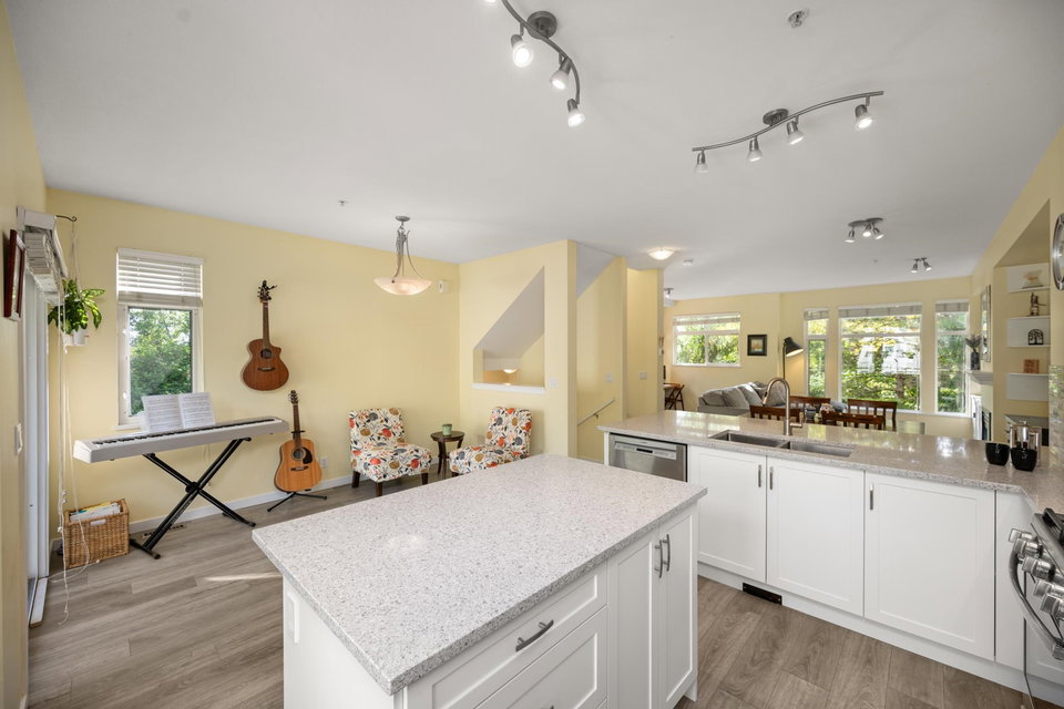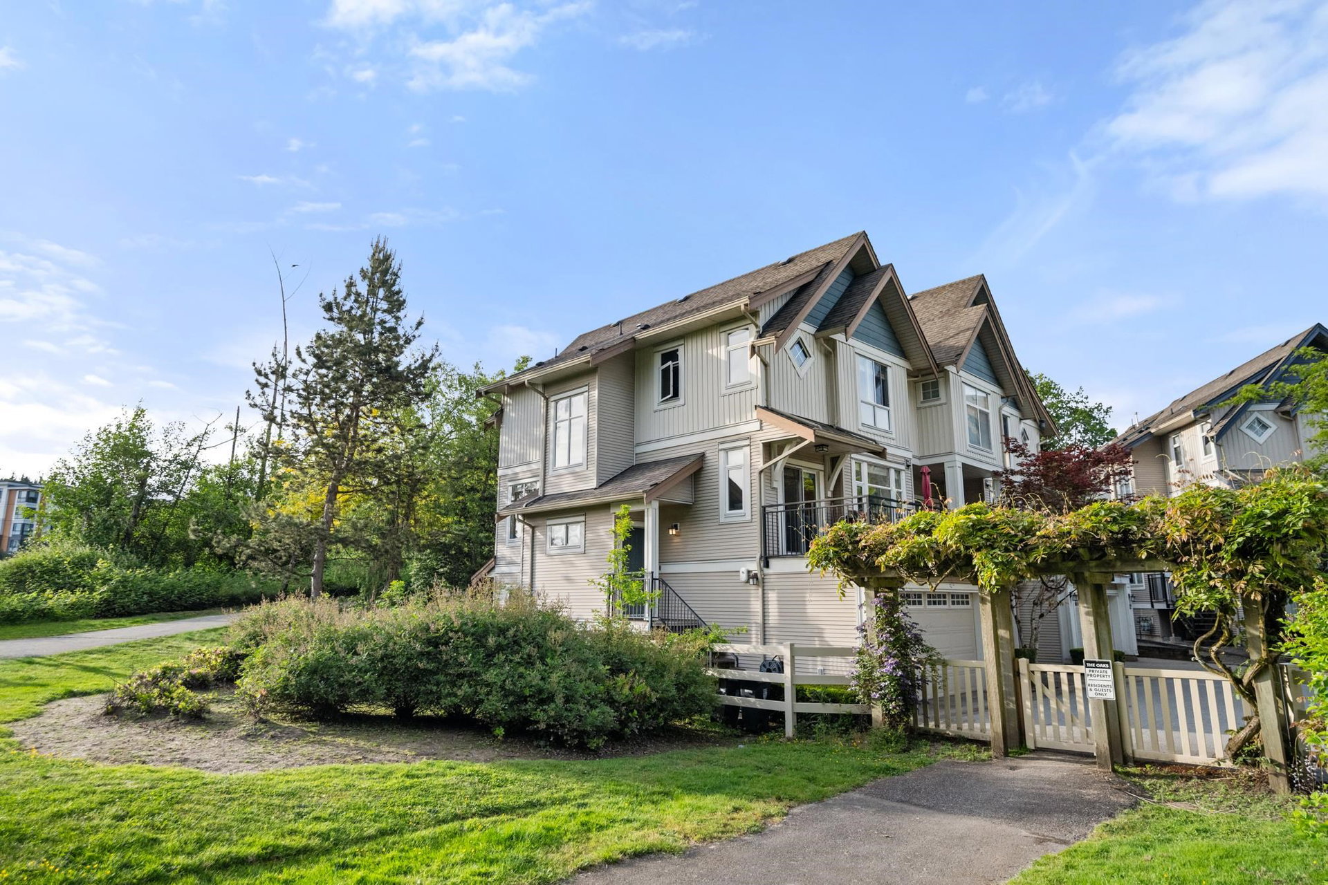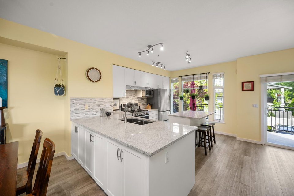 Beautifully updated 4-bed, 3-bath, End Unit townhome at The Oaks with nearly 1,800 square feet of living space! Surrounded by trees and adjacent to a community trail, every window offers a green view, providing unusual privacy for townhome living. Recently updated with vinyl plank floors, quartz counters, and a sleek kitchen redesign with added cabinets. All appliances have been replaced for peace of mind. Spacious flex room or fourth bedroom with full bath on entry level—ideal for guests, office, media/games room or gym. Custom-built-ins add function and charm, while the fenced rear yard offers a private retreat in nature. Well-managed, properly funded strata. Side-by-side garage parking! Walk to shops, schools, library, and transit!