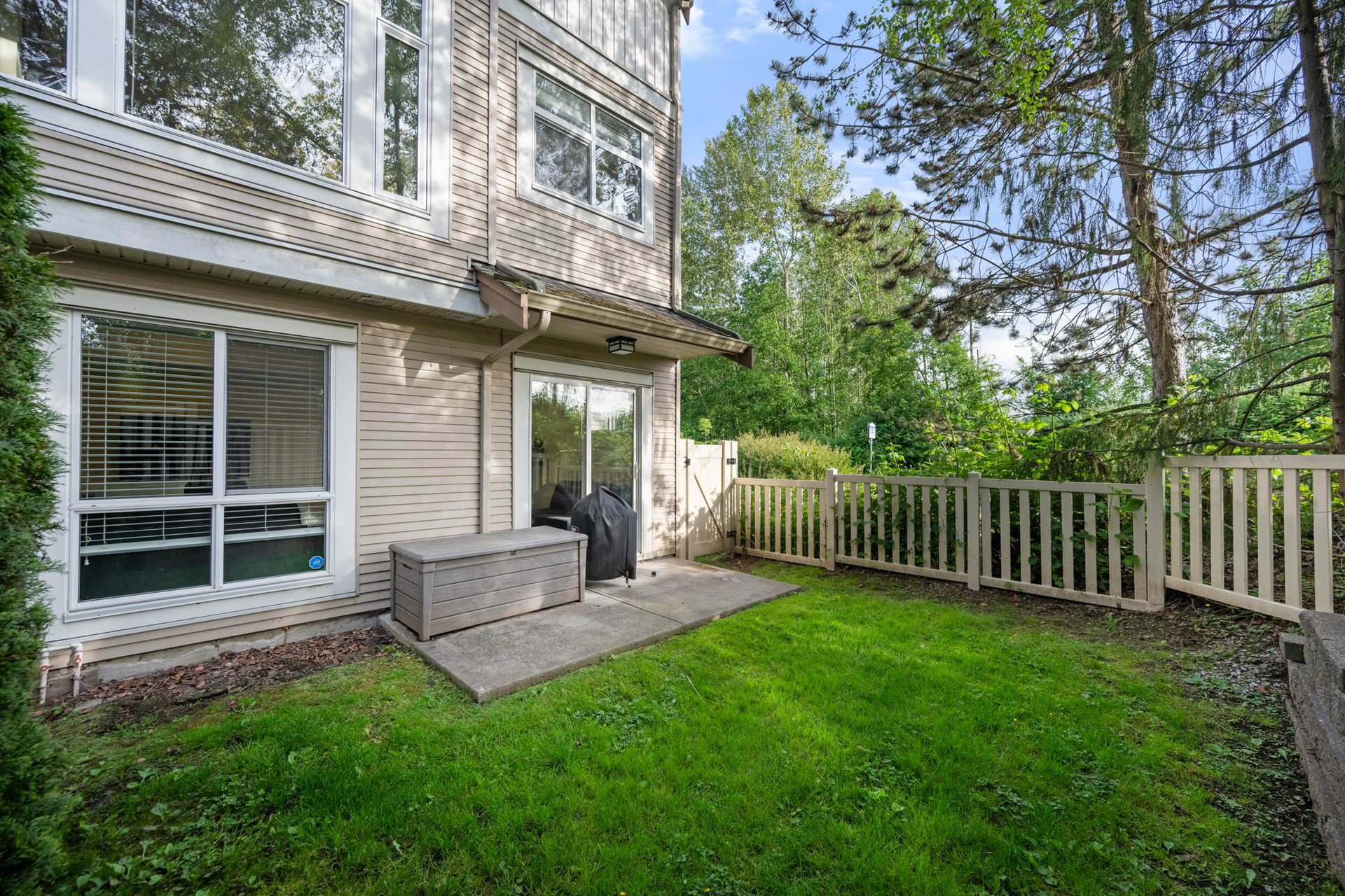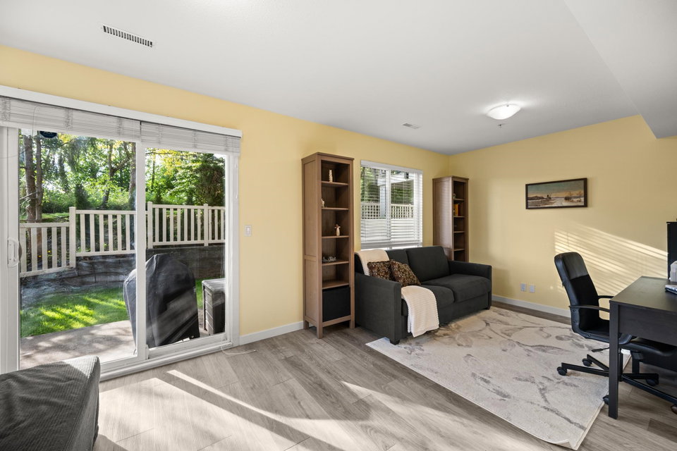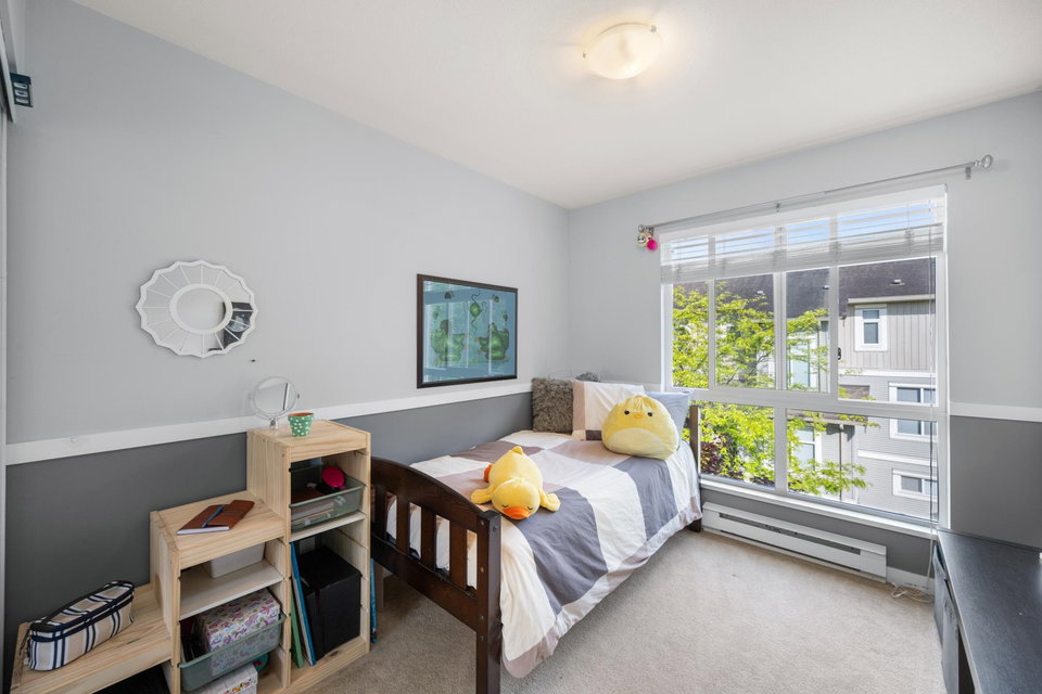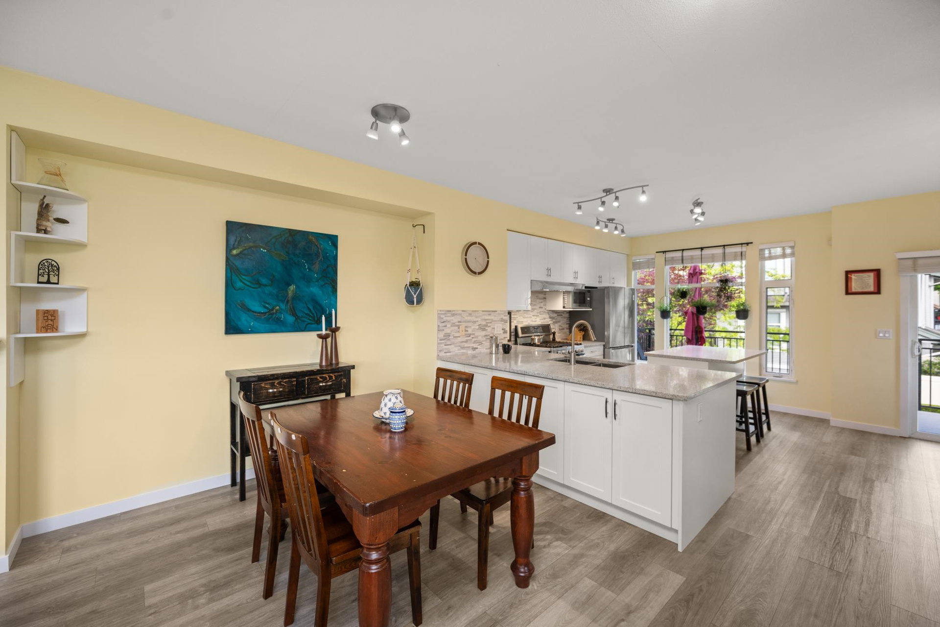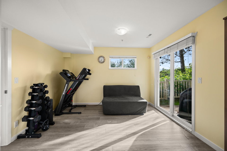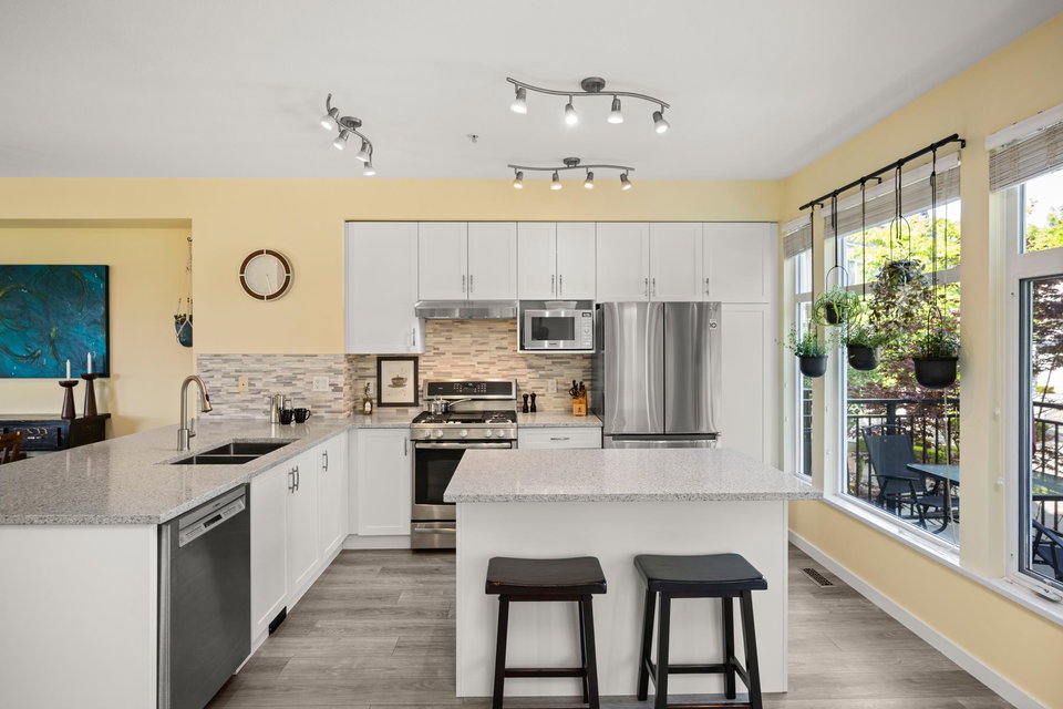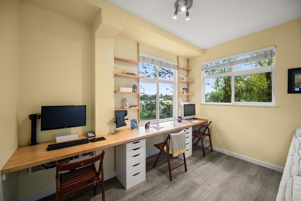 Beautifully updated 4-bed, 3-bath, End Unit townhome at The Oaks with nearly 1,800 square feet of living space! Surrounded by trees and adjacent to a community trail, every window offers a green view, providing unusual privacy for townhome living. Recently updated with vinyl plank floors, quartz counters, and a sleek kitchen redesign with added cabinets. All appliances have been replaced for peace of mind. Spacious flex room or fourth bedroom with full bath on entry level—ideal for guests, office, media/games room or gym. Custom-built-ins add function and charm, while the fenced rear yard offers a private retreat in nature. Well-managed, properly funded strata. Side-by-side garage parking! Walk to shops, schools, library, and transit!