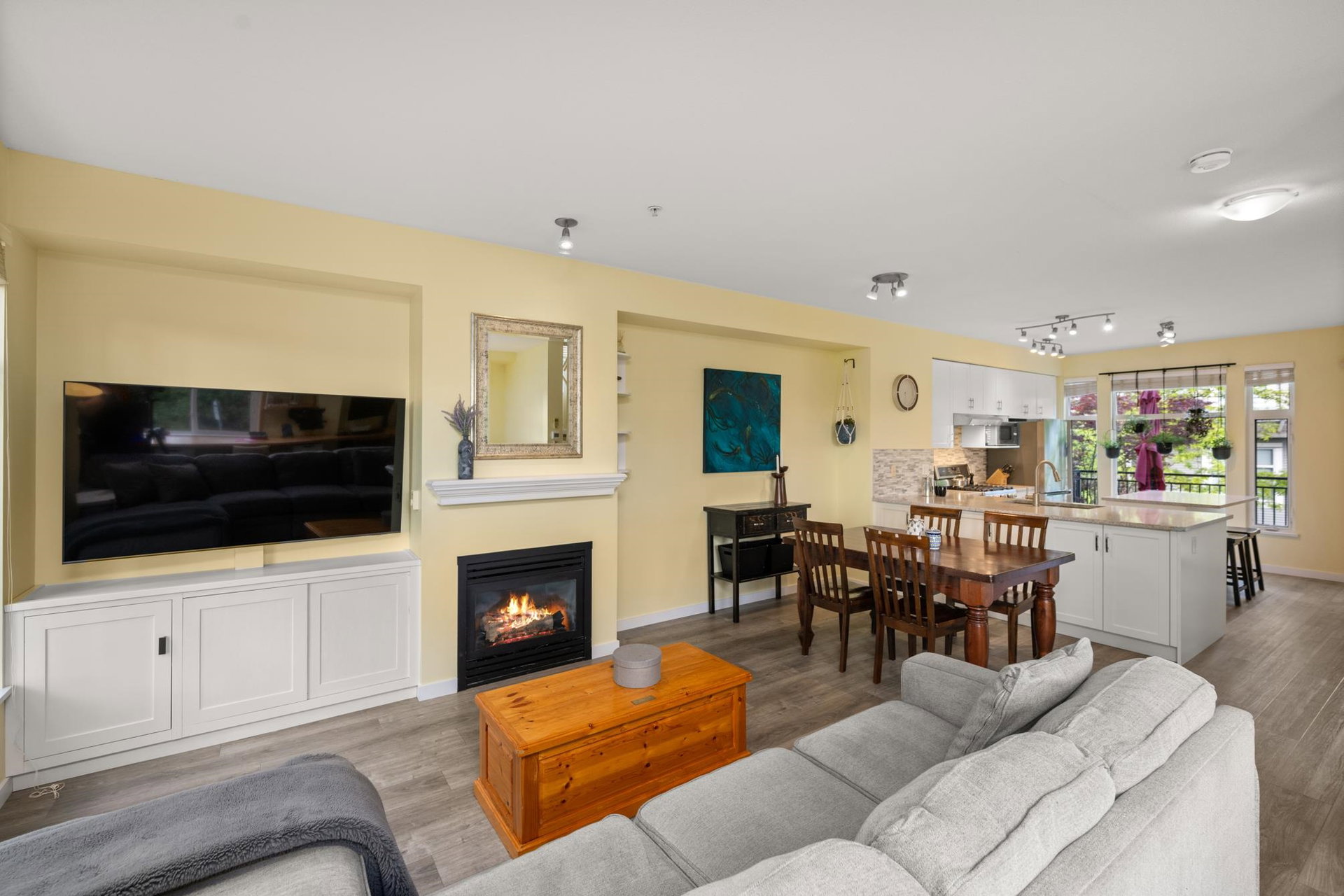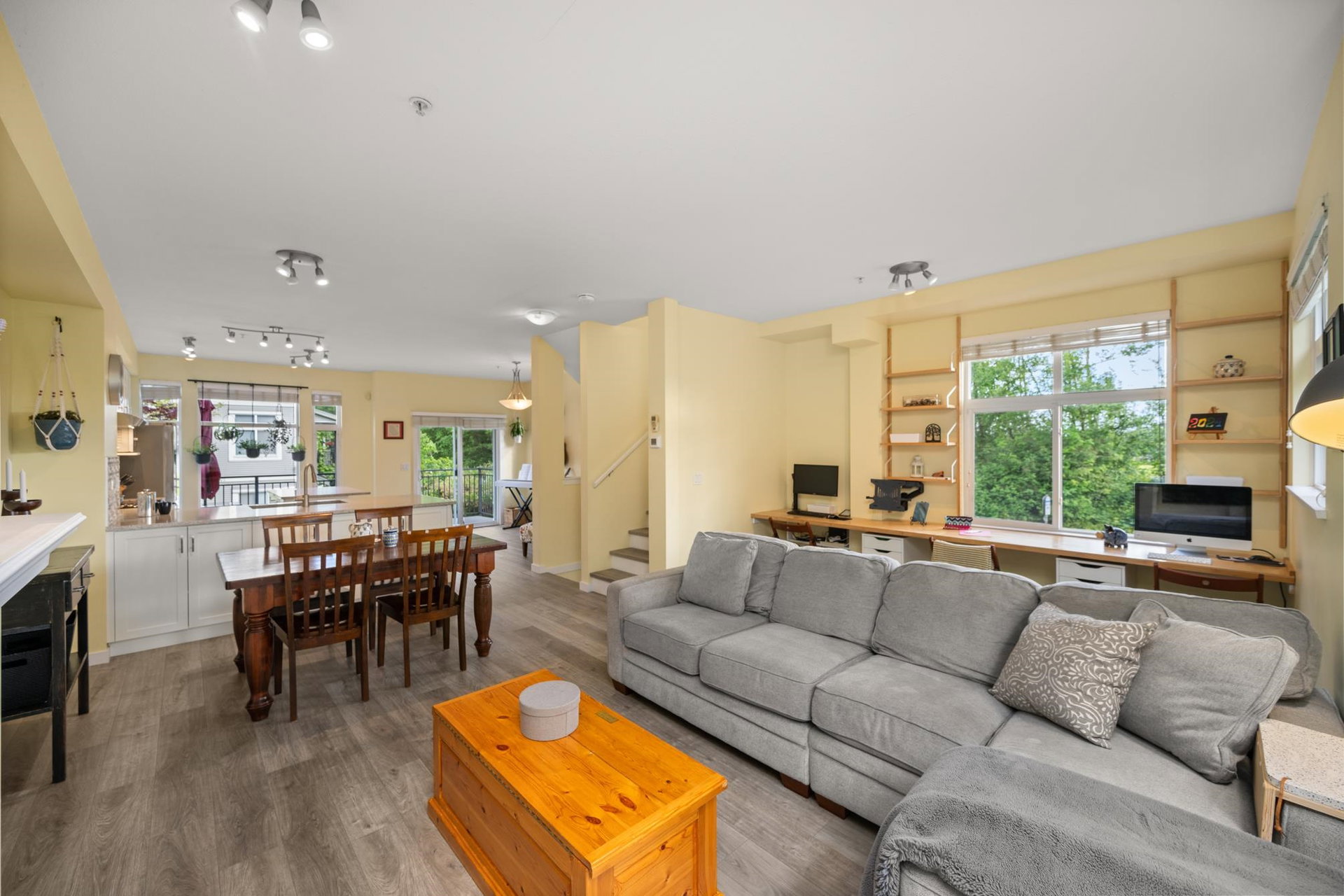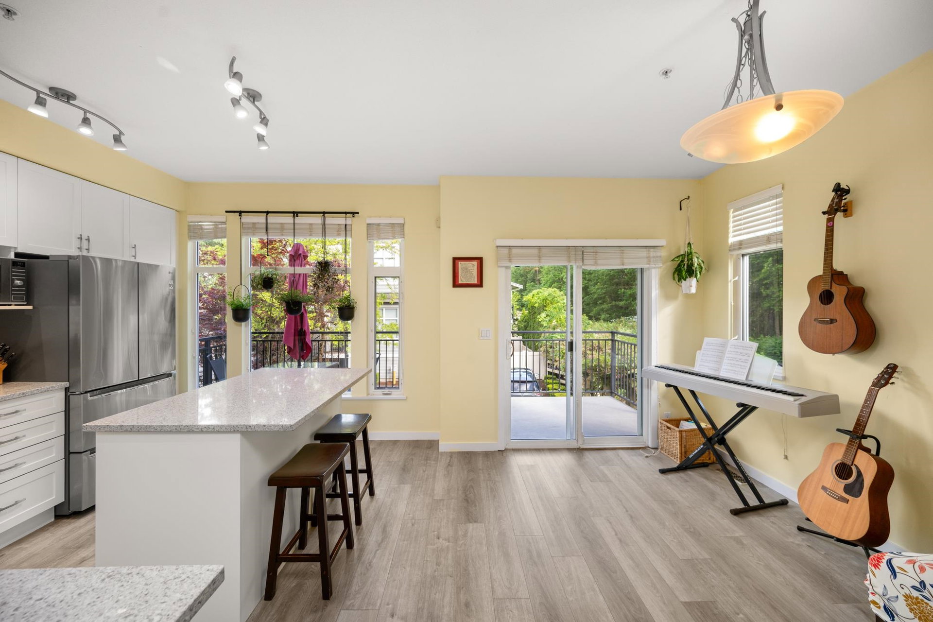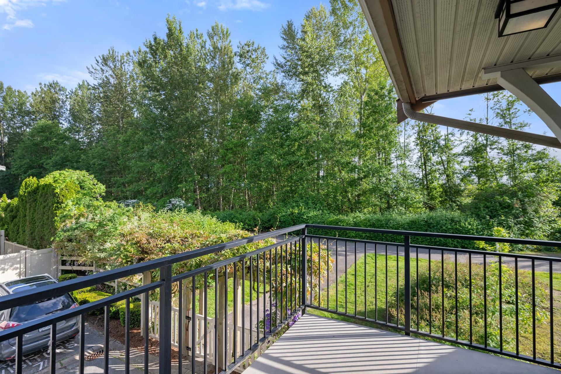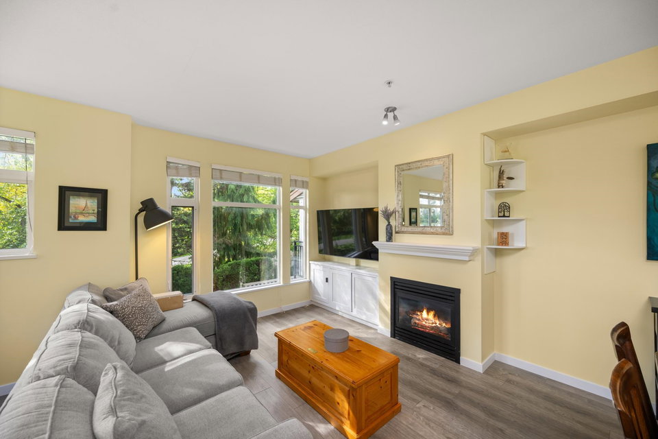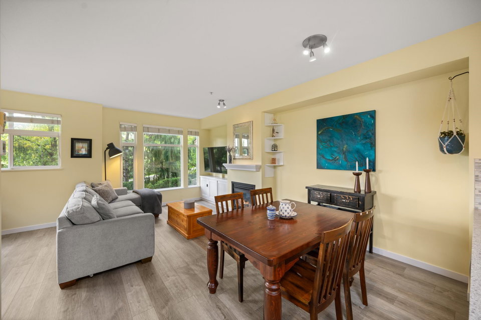 Beautifully updated 4-bed, 3-bath, End Unit townhome at The Oaks with nearly 1,800 square feet of living space! Surrounded by trees and adjacent to a community trail, every window offers a green view, providing unusual privacy for townhome living. Recently updated with vinyl plank floors, quartz counters, and a sleek kitchen redesign with added cabinets. All appliances have been replaced for peace of mind. Spacious flex room or fourth bedroom with full bath on entry level—ideal for guests, office, media/games room or gym. Custom-built-ins add function and charm, while the fenced rear yard offers a private retreat in nature. Well-managed, properly funded strata. Side-by-side garage parking! Walk to shops, schools, library, and transit!