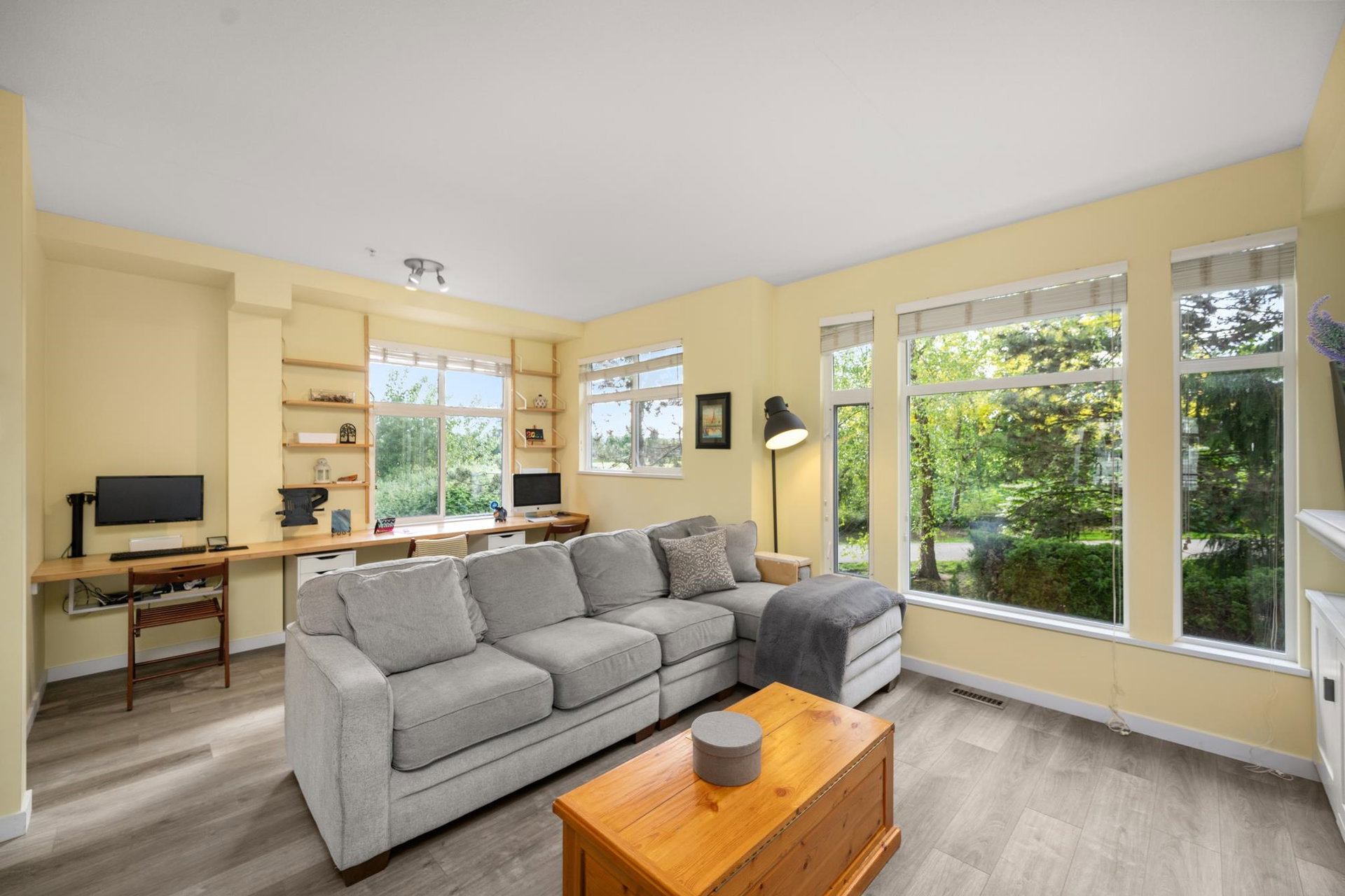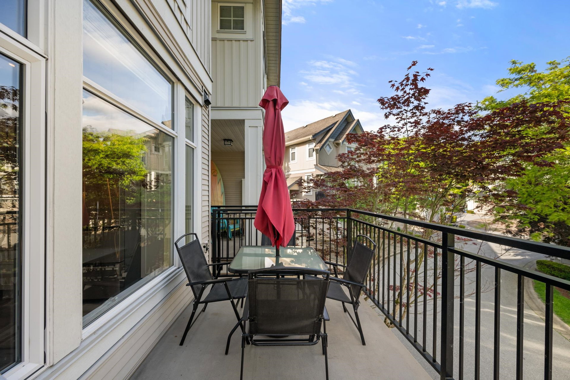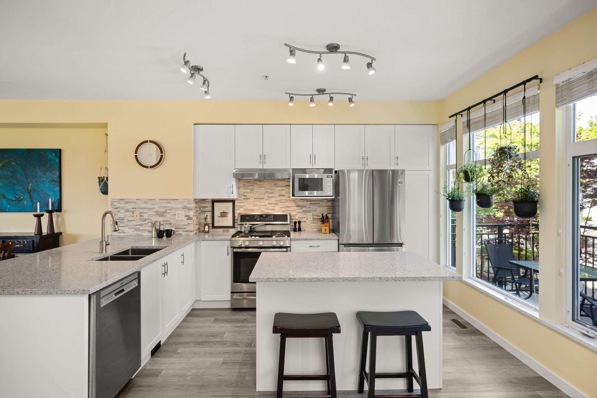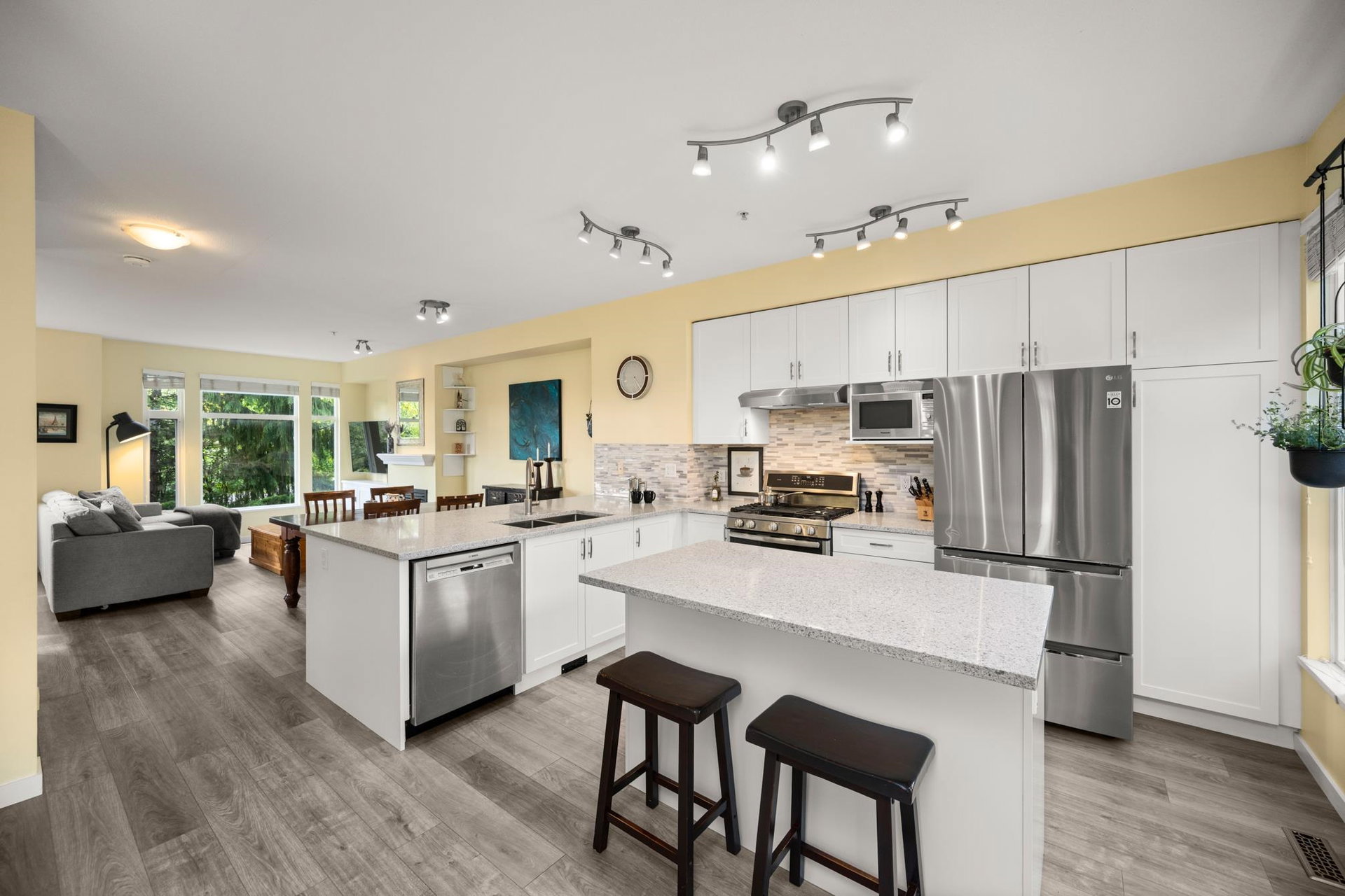 Beautifully updated 4-bed, 3-bath, End Unit townhome at The Oaks with nearly 1,800 square feet of living space! Surrounded by trees and adjacent to a community trail, every window offers a green view, providing unusual privacy for townhome living. Recently updated with vinyl plank floors, quartz counters, and a sleek kitchen redesign with added cabinets. All appliances have been replaced for peace of mind. Spacious flex room or fourth bedroom with full bath on entry level—ideal for guests, office, media/games room or gym. Custom-built-ins add function and charm, while the fenced rear yard offers a private retreat in nature. Well-managed, properly funded strata. Side-by-side garage parking! Walk to shops, schools, library, and transit!