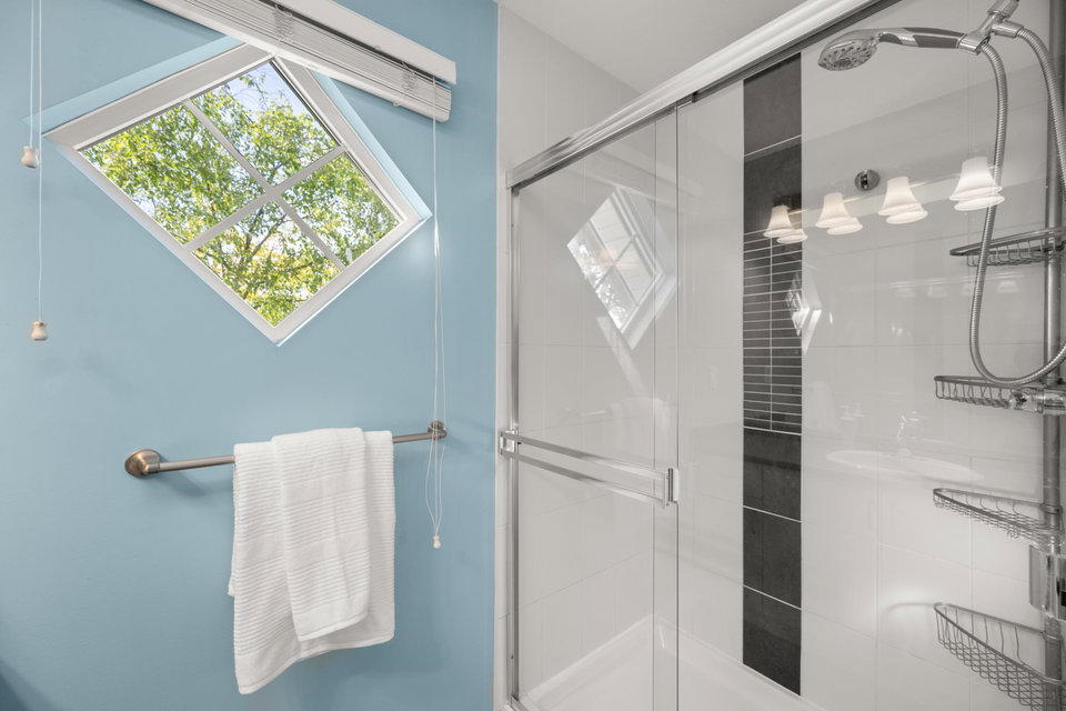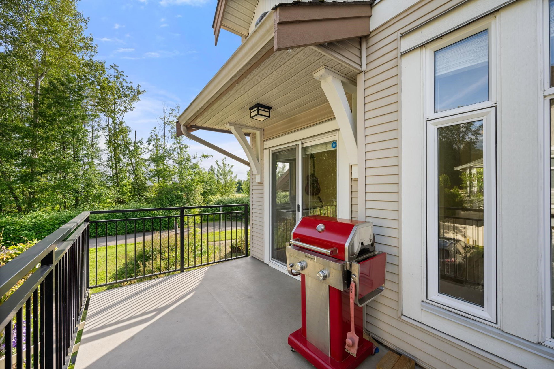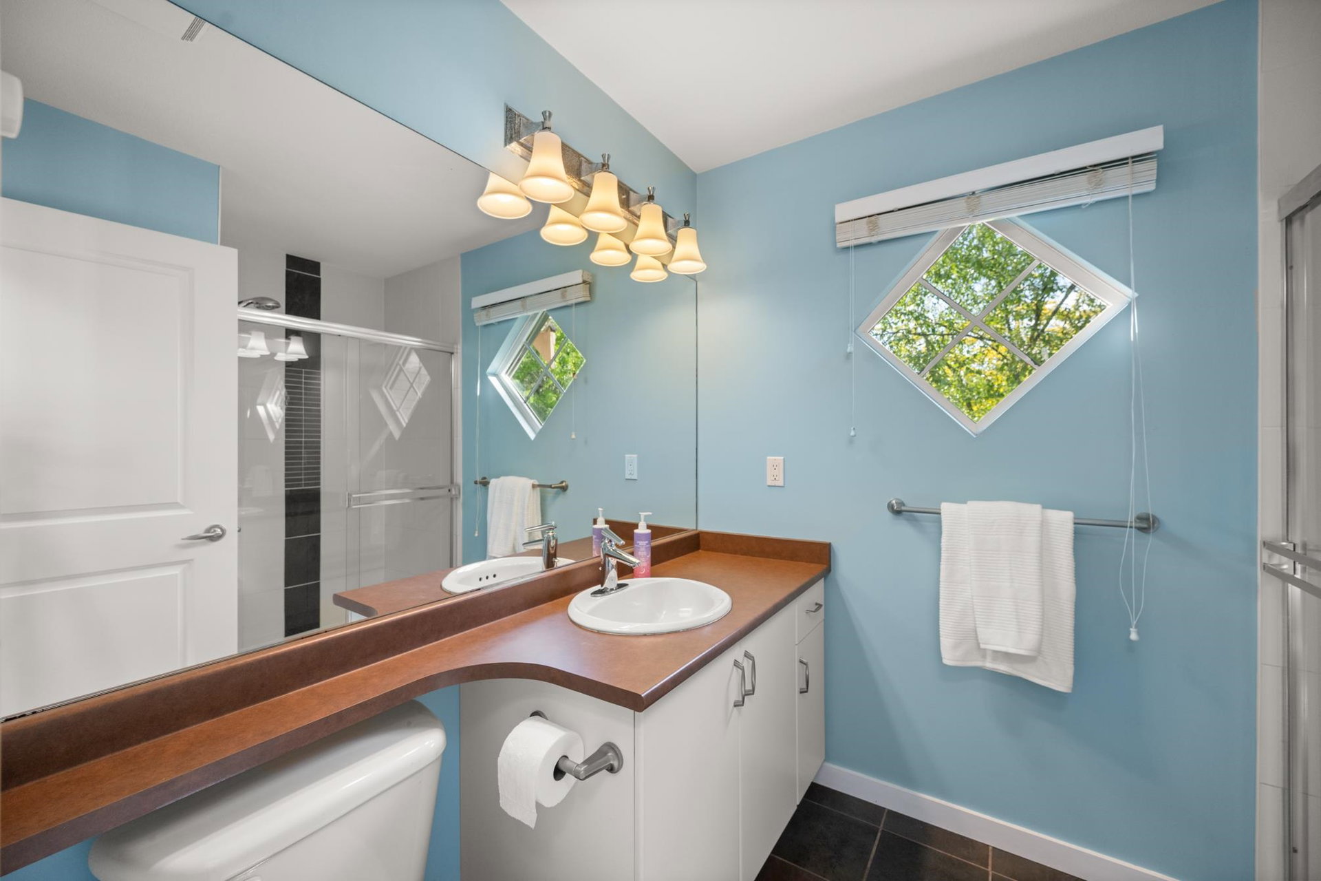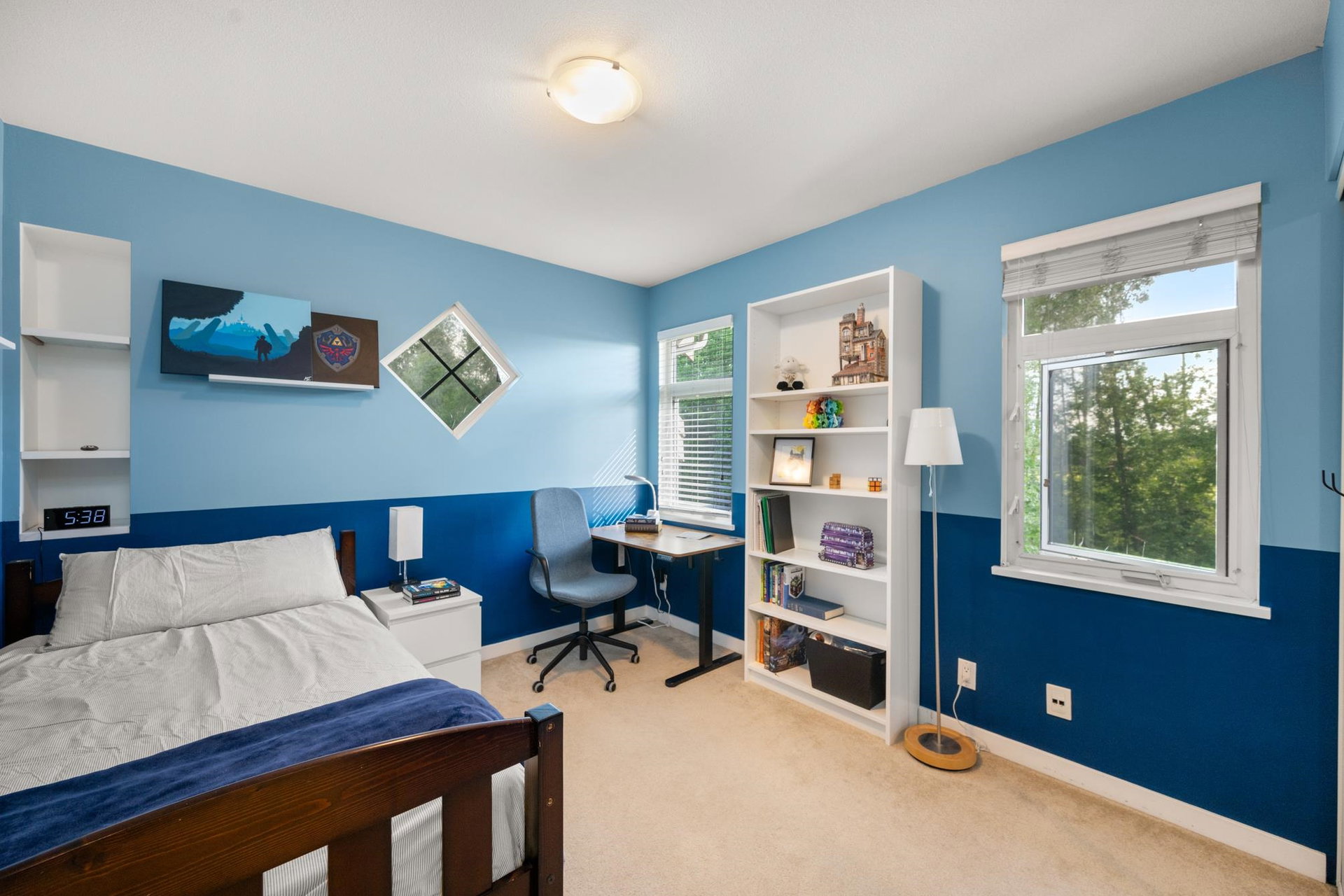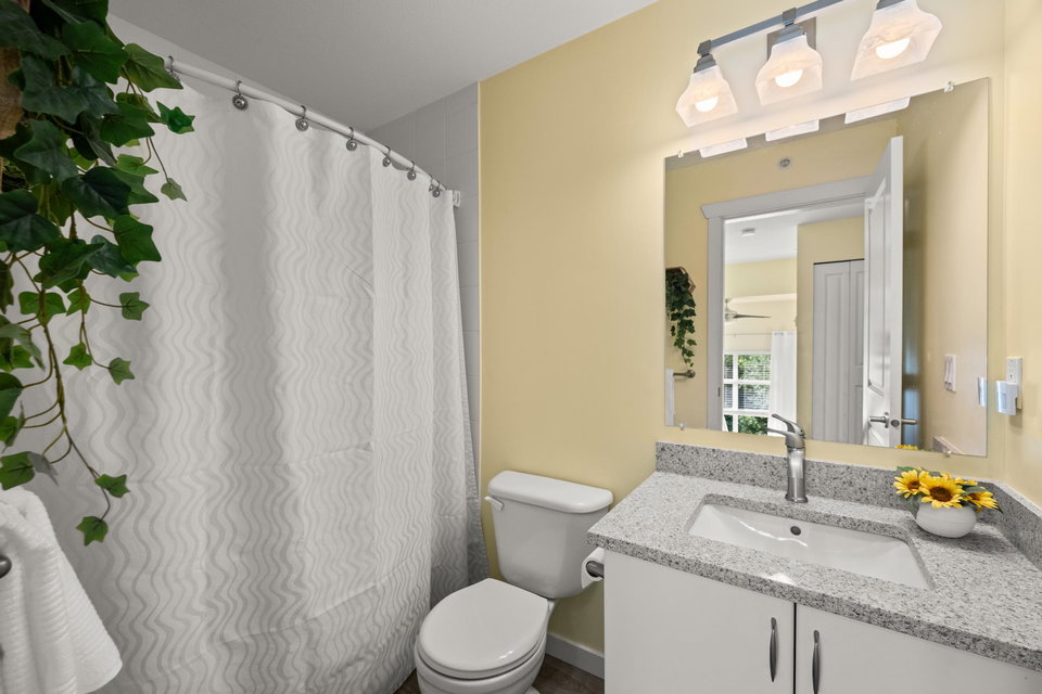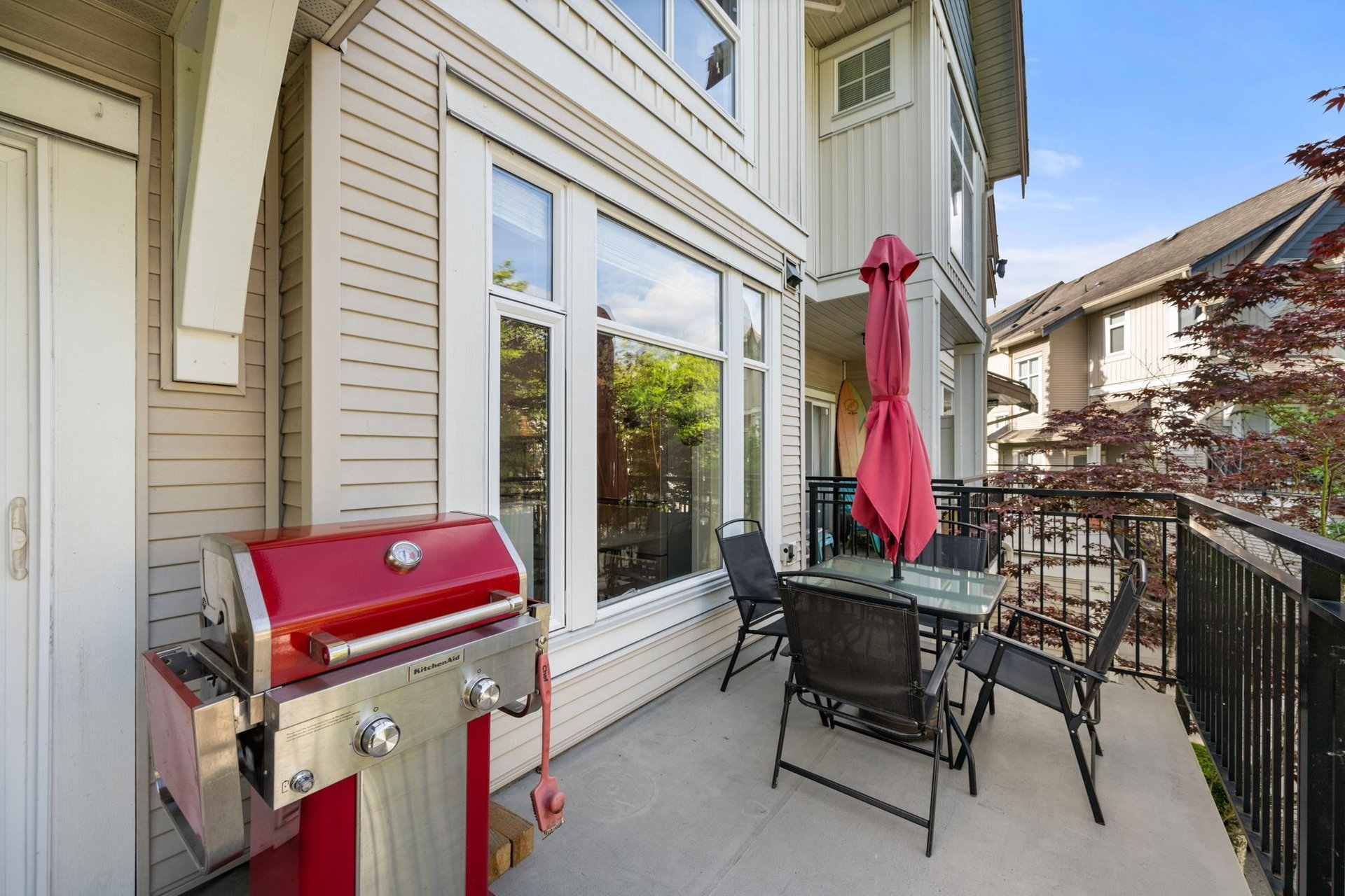 Beautifully updated 4-bed, 3-bath, End Unit townhome at The Oaks with nearly 1,800 square feet of living space! Surrounded by trees and adjacent to a community trail, every window offers a green view, providing unusual privacy for townhome living. Recently updated with vinyl plank floors, quartz counters, and a sleek kitchen redesign with added cabinets. All appliances have been replaced for peace of mind. Spacious flex room or fourth bedroom with full bath on entry level—ideal for guests, office, media/games room or gym. Custom-built-ins add function and charm, while the fenced rear yard offers a private retreat in nature. Well-managed, properly funded strata. Side-by-side garage parking! Walk to shops, schools, library, and transit!