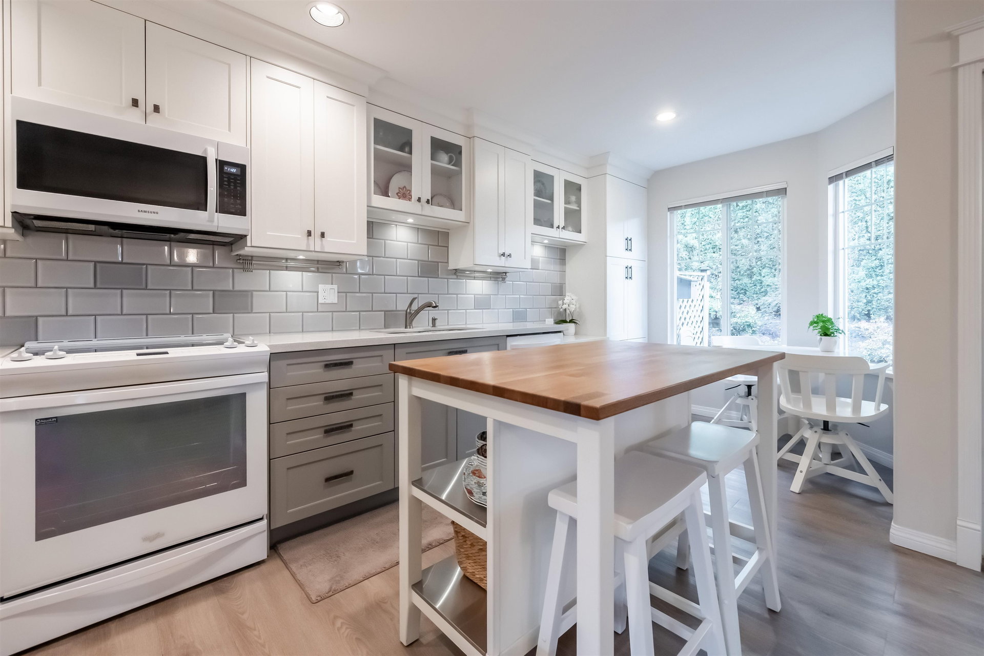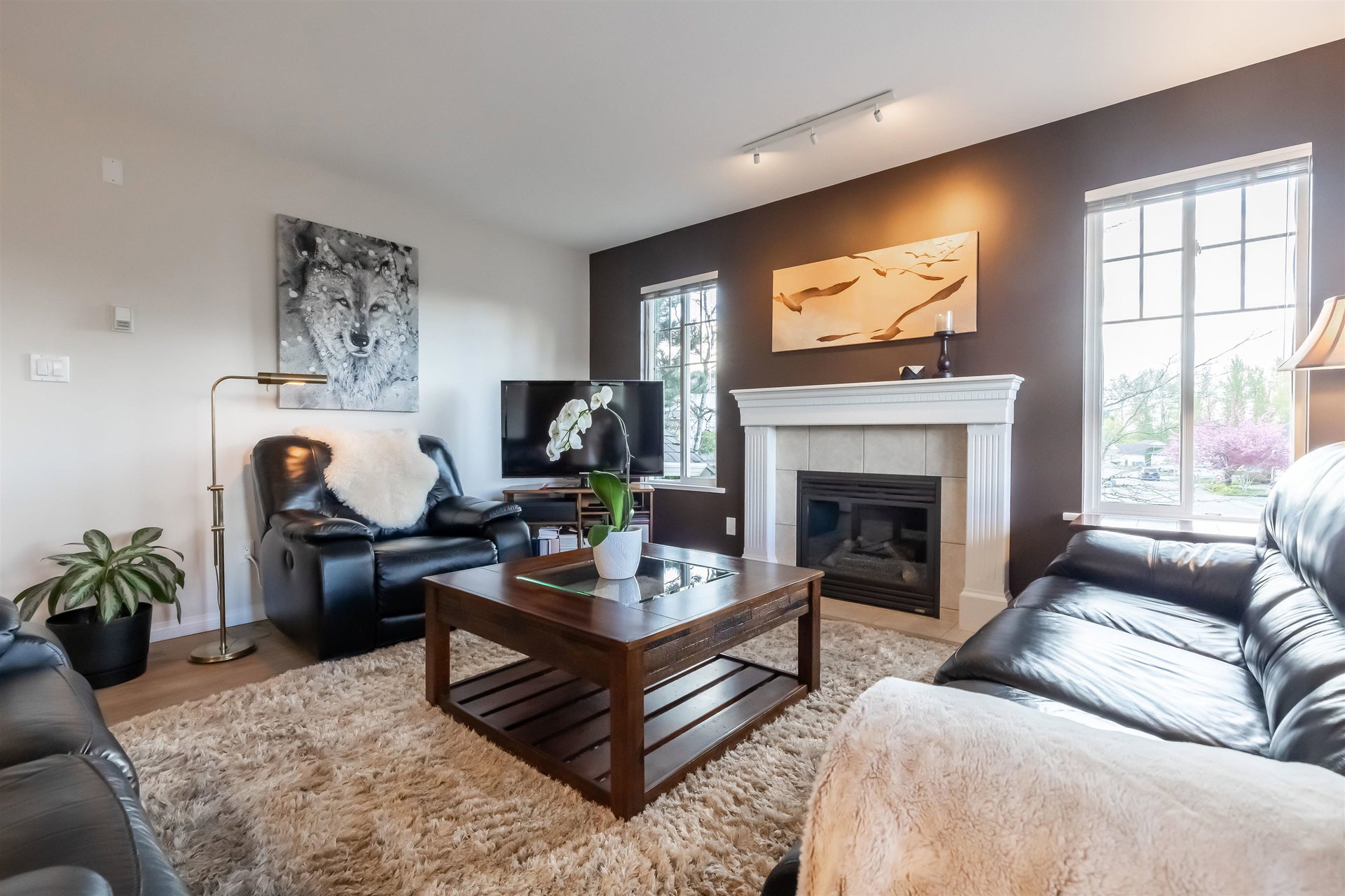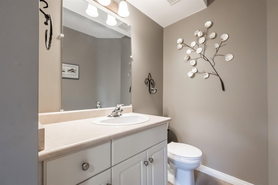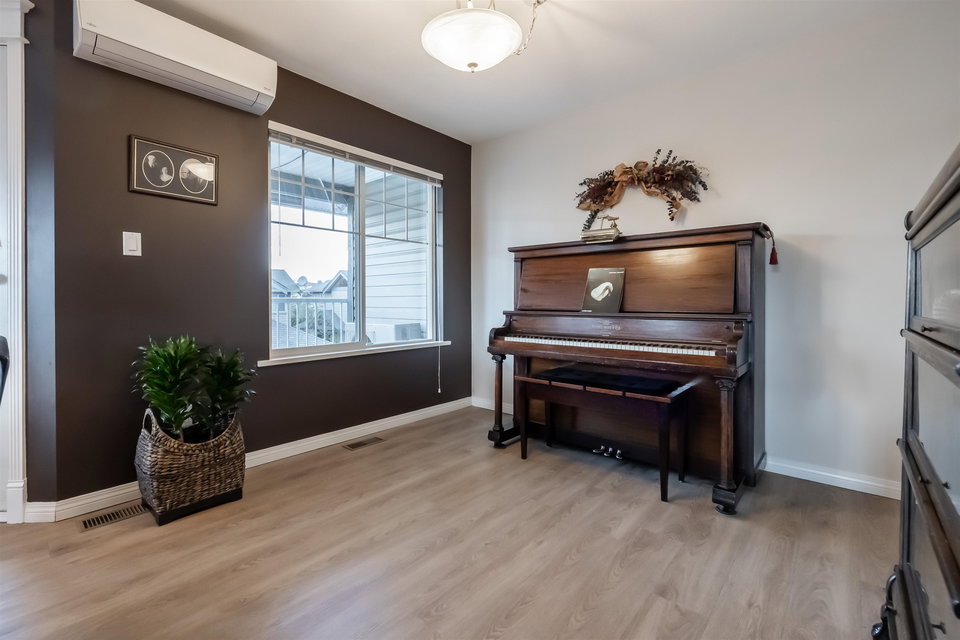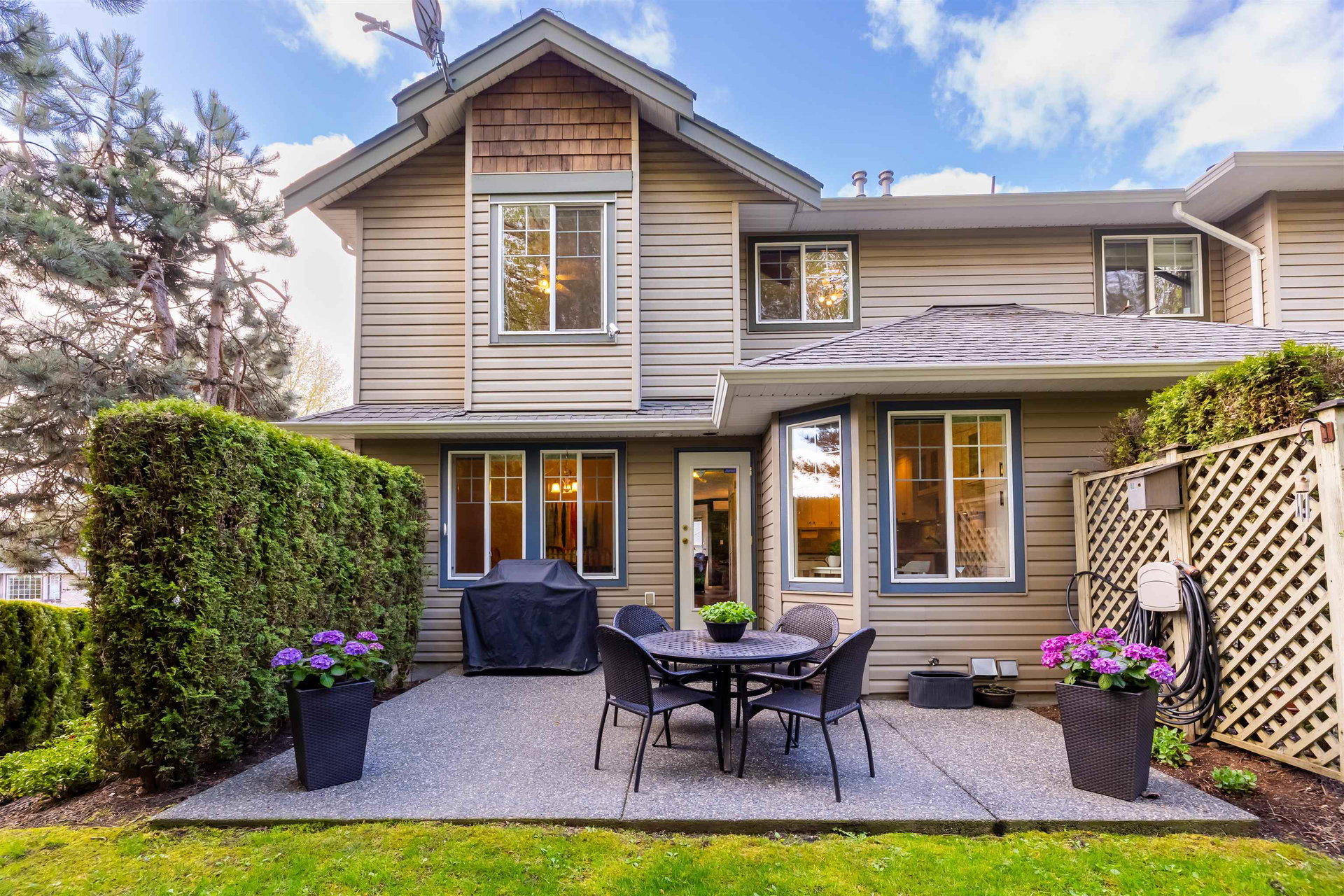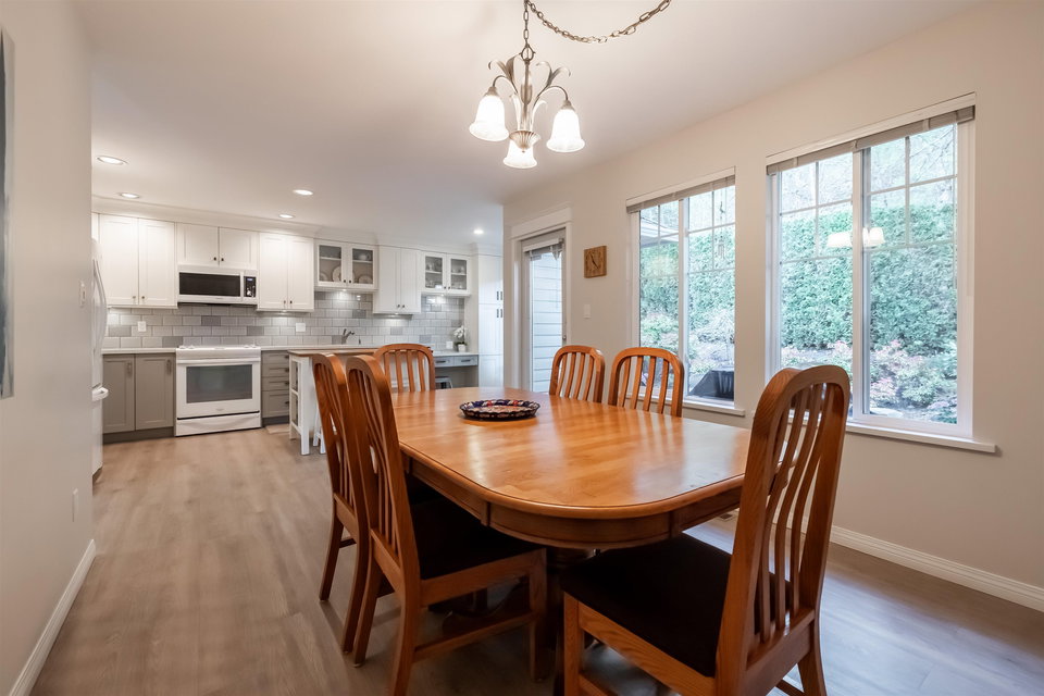 Welcome to Blue Jay Hills in beautiful West Abbotsford! This charming 4 bedroom, 3 bathroom END UNIT family townhome backs onto a greenbelt and feels very private. This home has 3 Bedrooms up with one Bedroom/Rec Room on the lower level, and is tastefully updated with newer floors, appliances, kitchen cabinets and quartz counters. Gas fireplace and newer hot water heater. Plenty of natural light in this home too. From the main level, walk out to the large patio and your backyard oasis. The heat pump allows you to remain comfortable. Complete with a two door extra-wide double garage. Dogs and cats allowed. Amazing location – just a few minutes from Highstreet Shopping Center and close to schools, walking and biking trails. Lots of parking in complex and cul de sac. Come see for yourself!