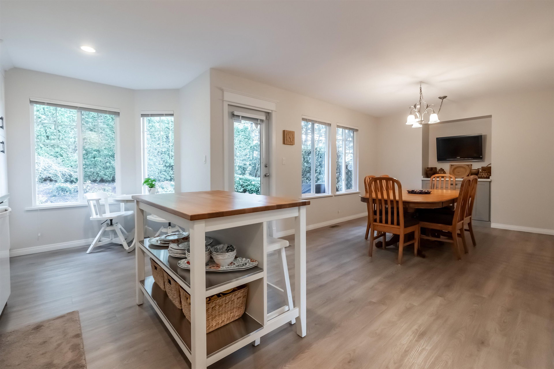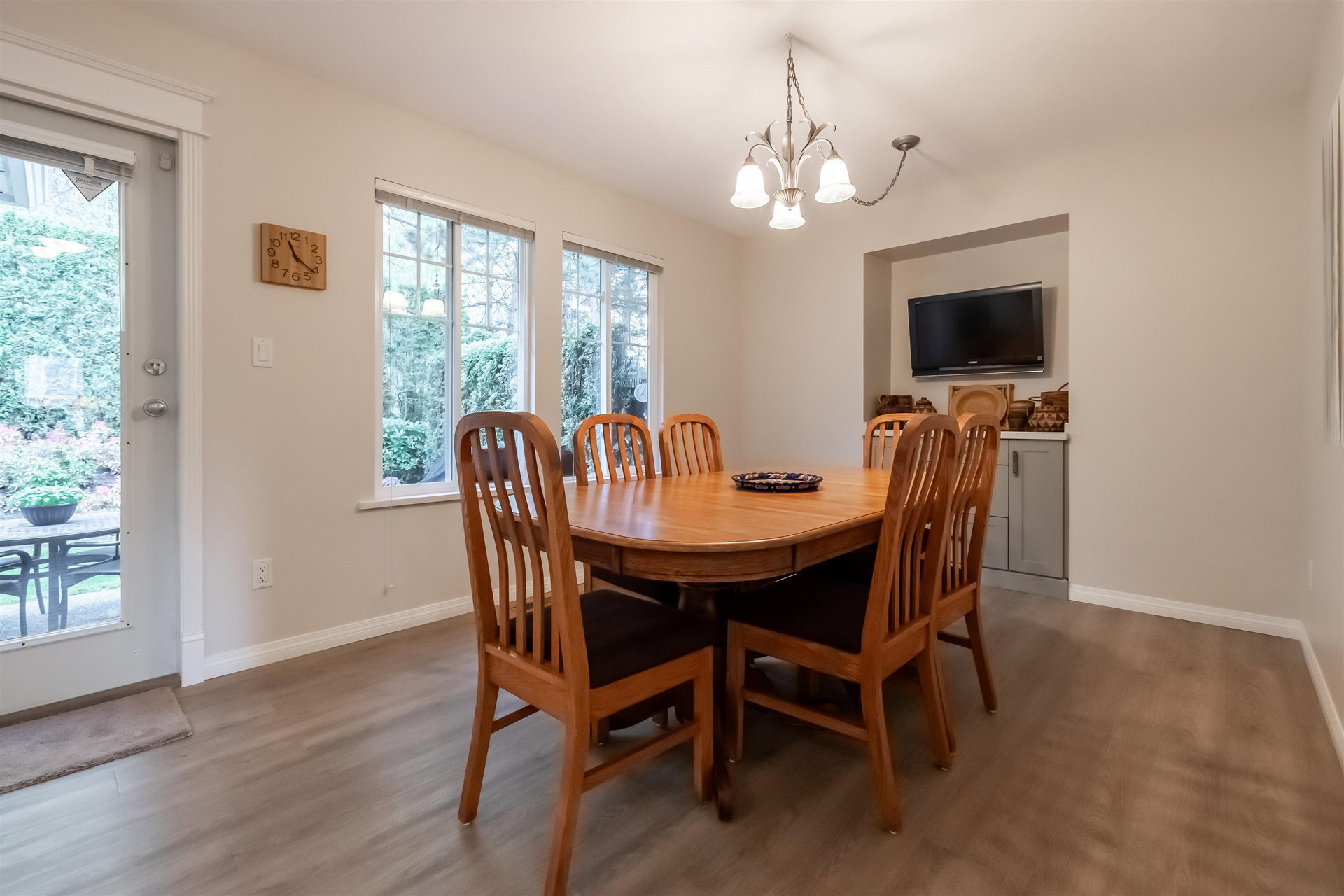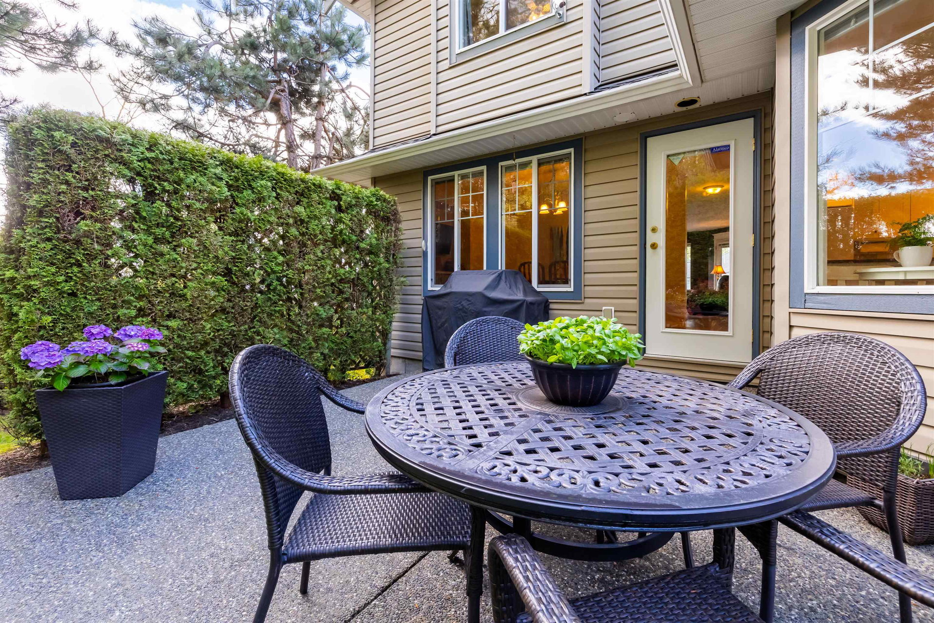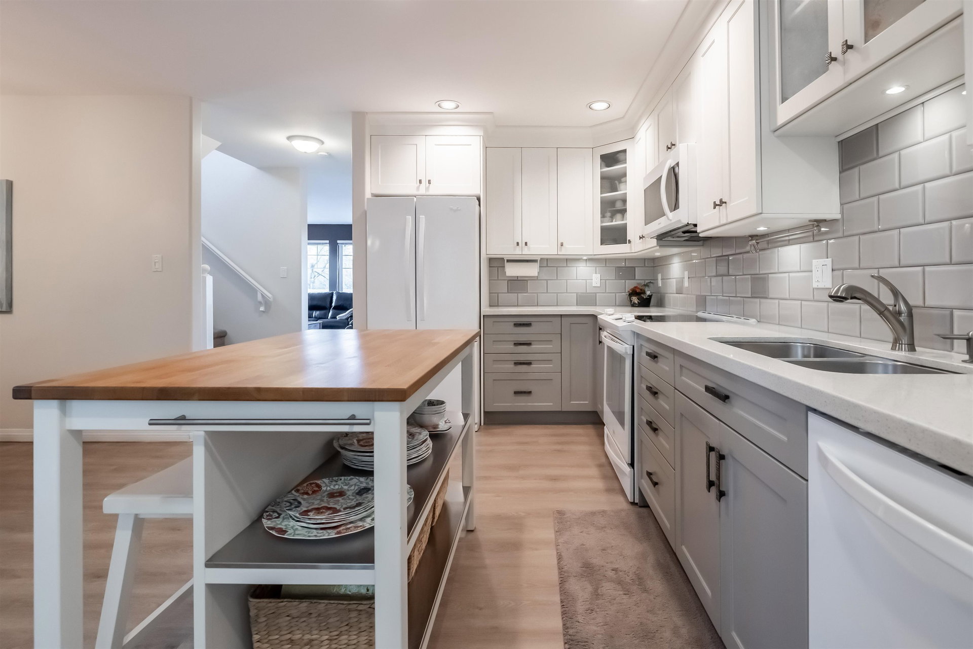 Welcome to Blue Jay Hills in beautiful West Abbotsford! This charming 4 bedroom, 3 bathroom END UNIT family townhome backs onto a greenbelt and feels very private. This home has 3 Bedrooms up with one Bedroom/Rec Room on the lower level, and is tastefully updated with newer floors, appliances, kitchen cabinets and quartz counters. Gas fireplace and newer hot water heater. Plenty of natural light in this home too. From the main level, walk out to the large patio and your backyard oasis. The heat pump allows you to remain comfortable. Complete with a two door extra-wide double garage. Dogs and cats allowed. Amazing location – just a few minutes from Highstreet Shopping Center and close to schools, walking and biking trails. Lots of parking in complex and cul de sac. Come see for yourself!