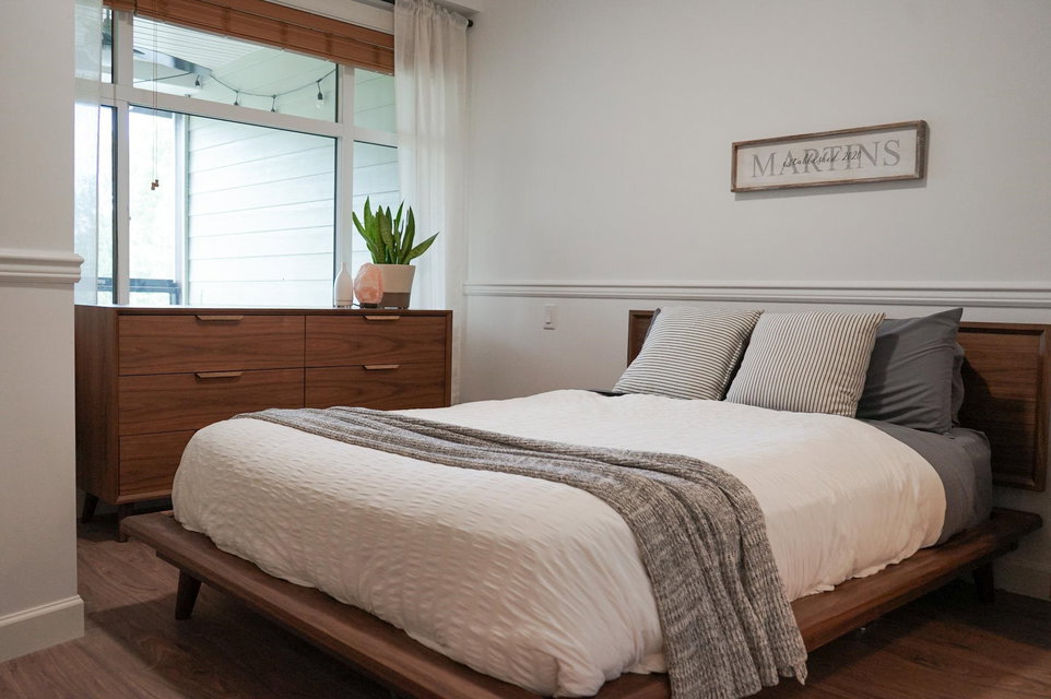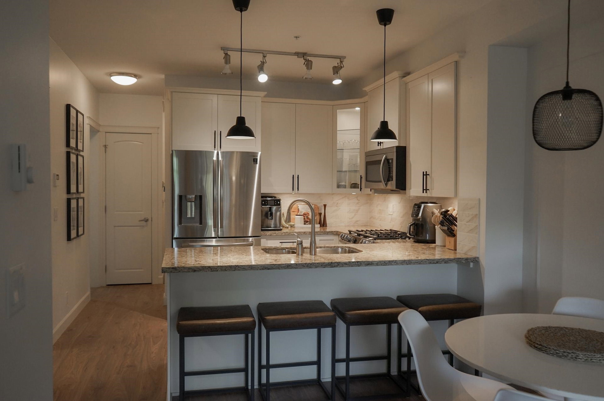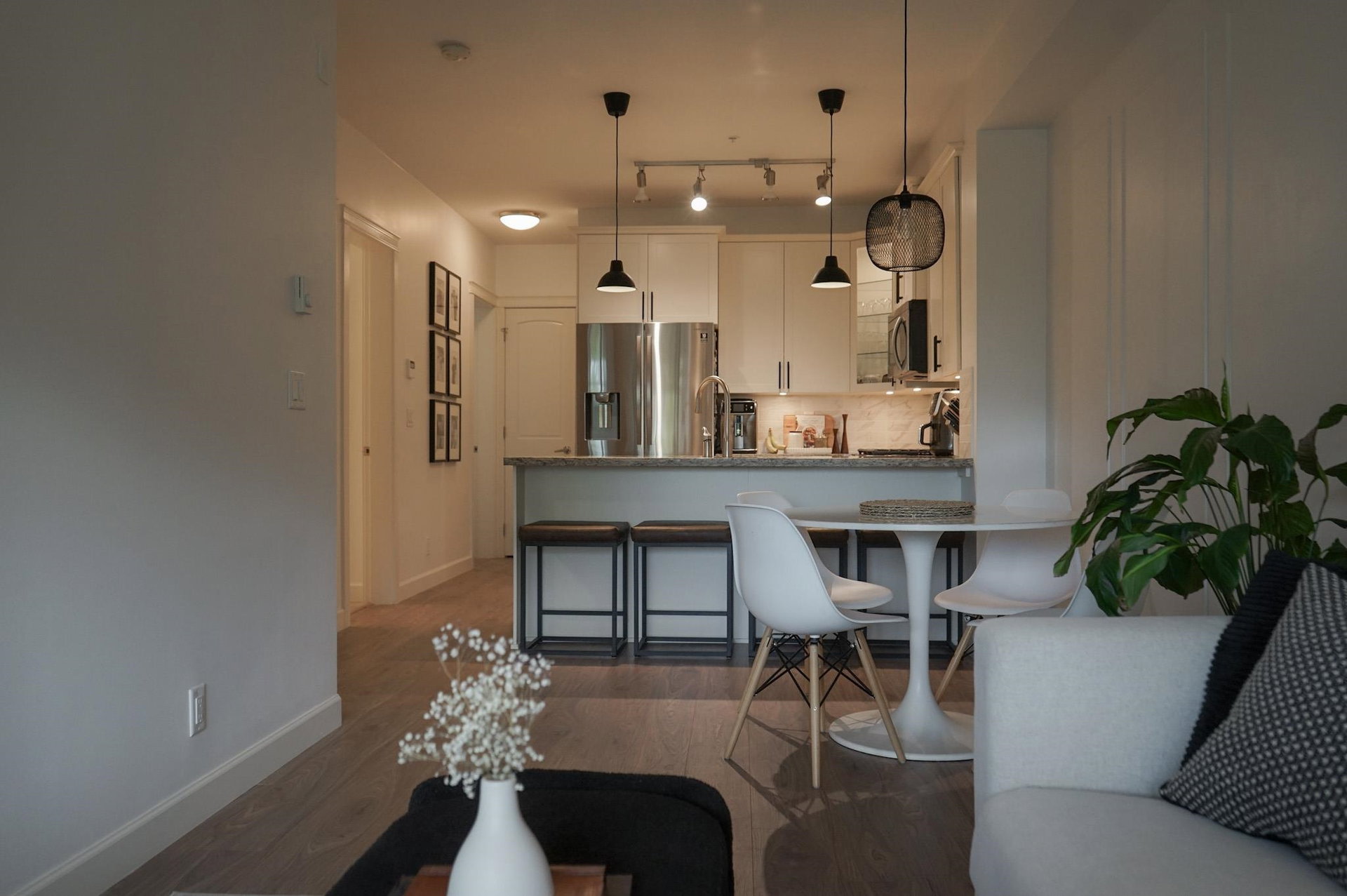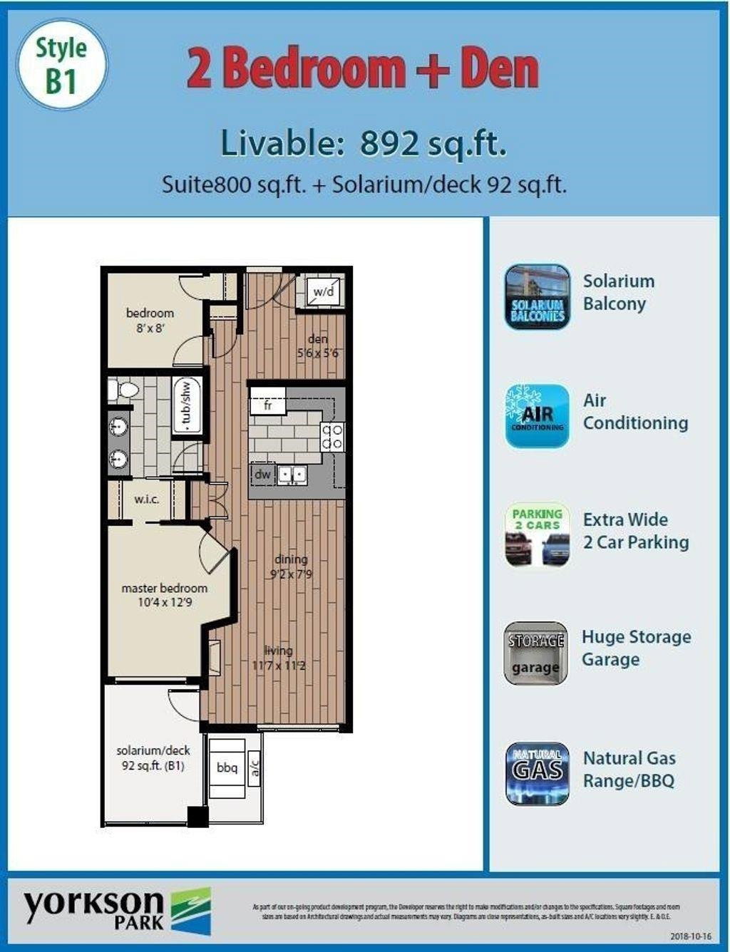 Welcome to Yorkson Park! This 2 bedroom and den, 1 bathroom unit features modern living with high-end finishes including a gourmet kitchen, high-end SS appliances, quartz counter tops, natural gas range, breakfasts bar, double sinks, heated flooring and lots of storage! The primary bedroom is spacious and includes a walk-in closest with direct access to bathroom. Den can be an ideal place for your home office. Includes 2 Parking spots (One with Level 2 Charging) and large storage unit! LOW STRATA: $289.06 per month that even covers gas / hot water! There is a 100sqft retractable glass solarium with enclosed BBQ area perfect for entertaining. Pet friendly so bring your dog or cats! Ideal central location with direct bus that goes to Lougheed Skytrain!