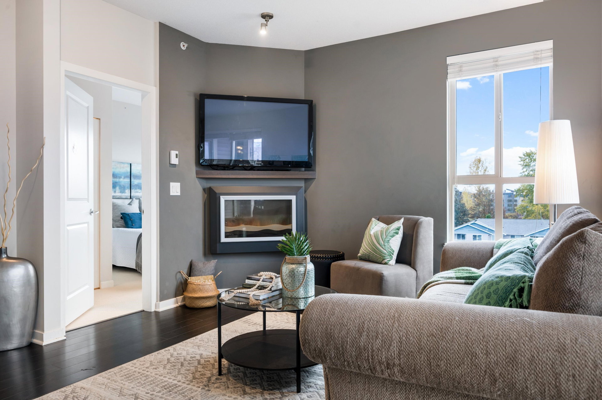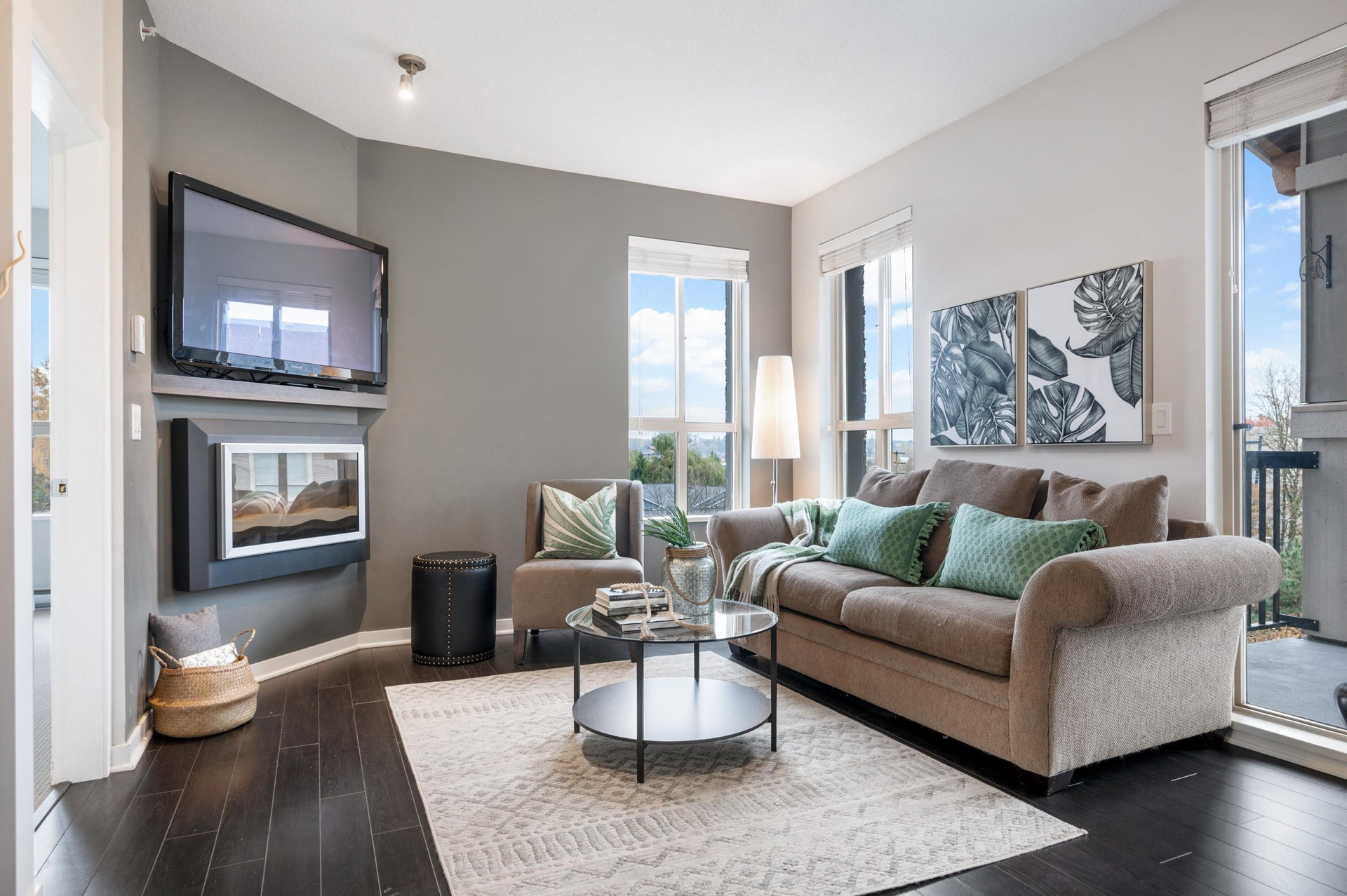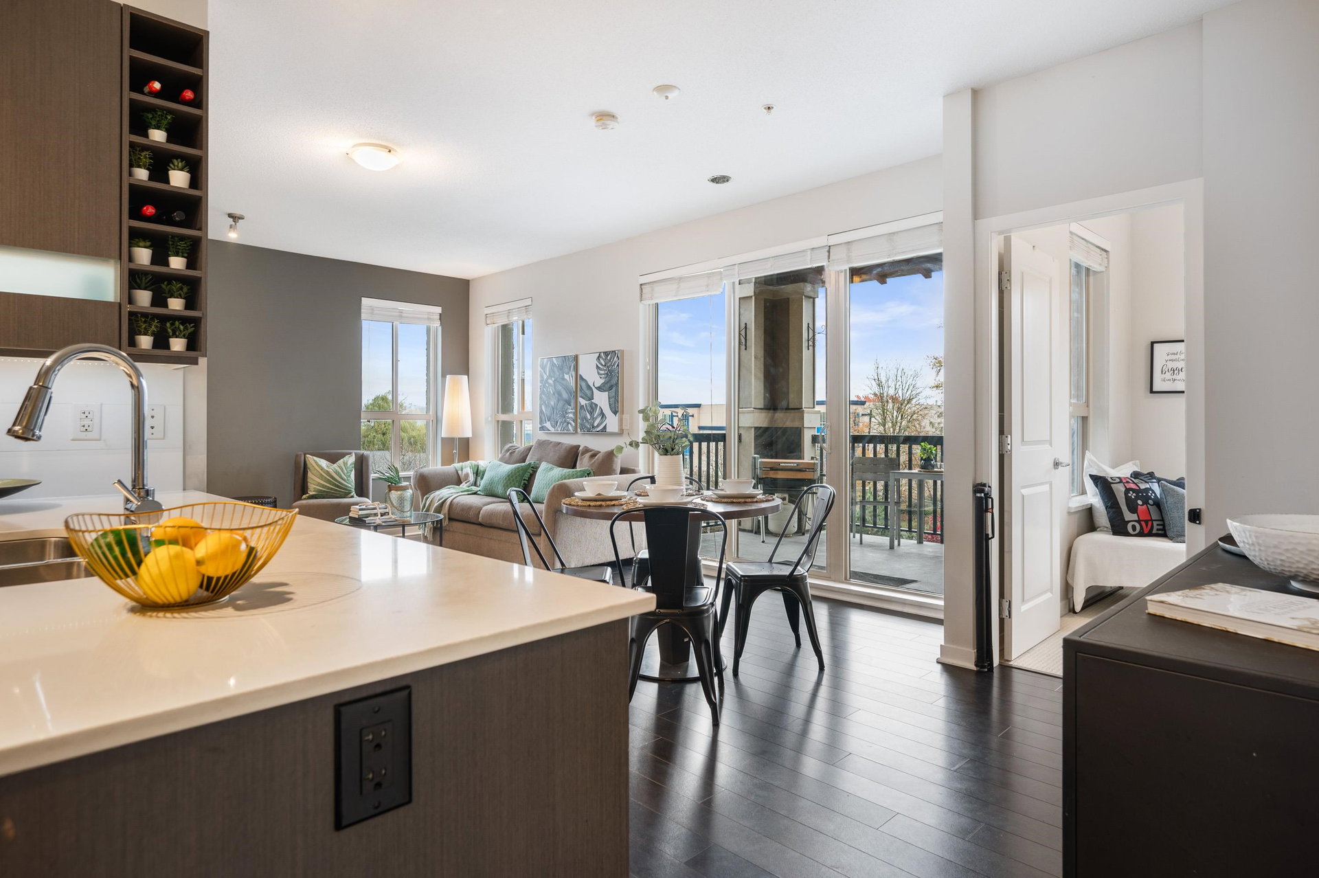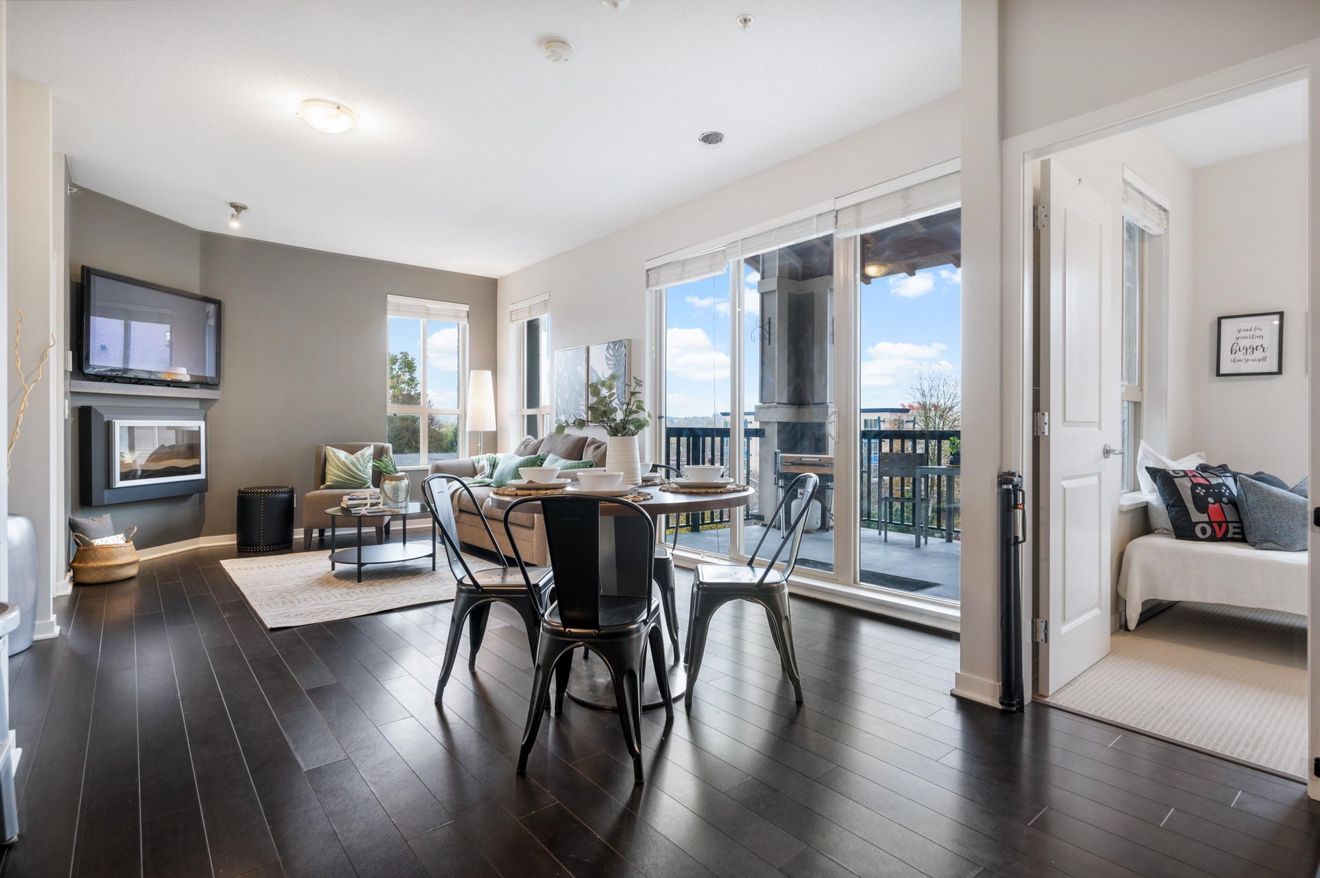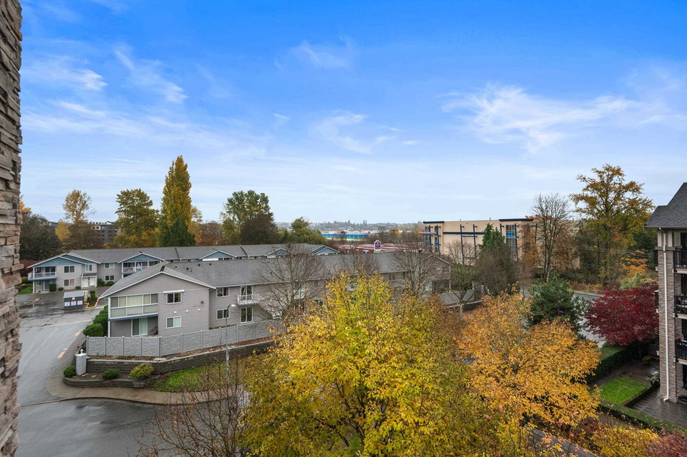TOP FLOOR 2 bed PLUS Den home in Popular Cornerstone Building. Perfectly situated within the complex, TRUE corner unit, lovely views of Mount Baker, and sunny south exp. Built by Marcon. This large 1010 Square foot Home has Open Concept Living with 9′ ceilings, Quartz Countertops, S/S Appliances, fresh paint, Electric Fireplace, new carpets in bedrooms. Master Bedroom Features a large Walk-in Closet & spa-like ensuite. 2 side by side Parking & DOUBLE storage locker Included. 2 Pets (no size restriction)& Rentals Allowed. Close to upcoming Skytrain line and loads of shopping in Langley.