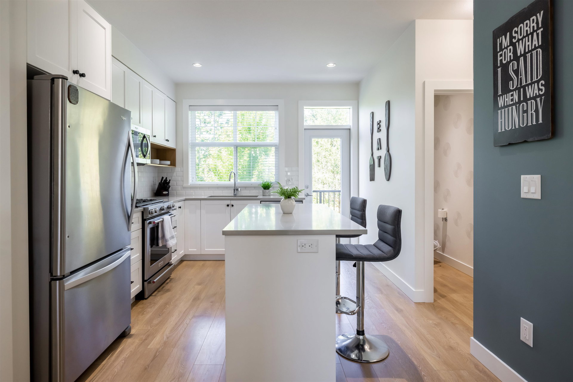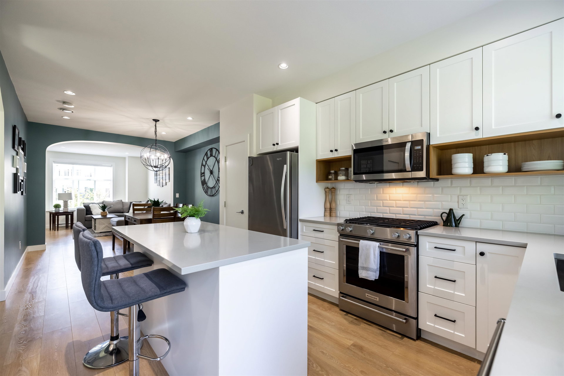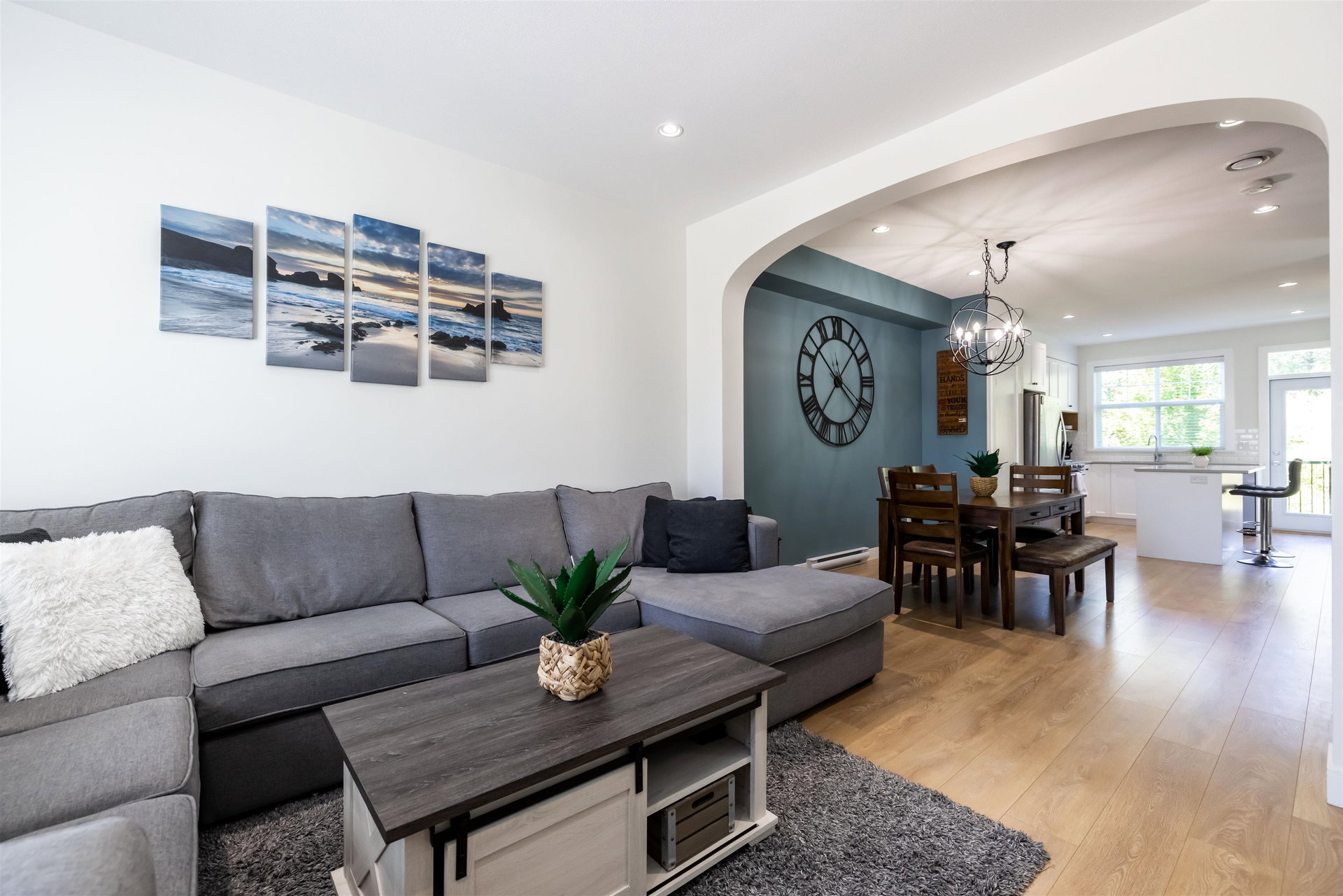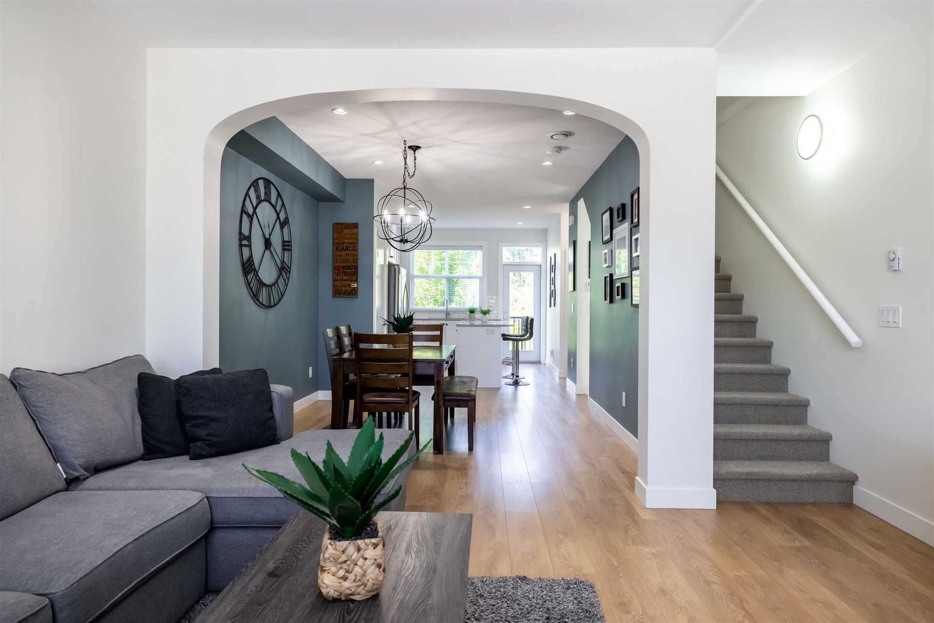 Beautiful west facing 3bed/3bath townhome in sought after Roundhouse. Newly painted, with modern colors, your new homes offers bright open concept main floor living with spacious kitchen and large island with access to back deck. Large dining room with arched entry to big living room which over looks the playground!. Upstairs features 2 kids bedrooms and master with walk thru closet and ensuite with double vanity and large shower. Lower level bonus space could be finished as family room/office or use the entire area for tandem garage parking. Backyard is fenced, with pretty garden and backs green space! Driveway fits a full size truck or SUV! Low maintenance fees and a great location make Roundhouse the perfect place to call home! Take a look!