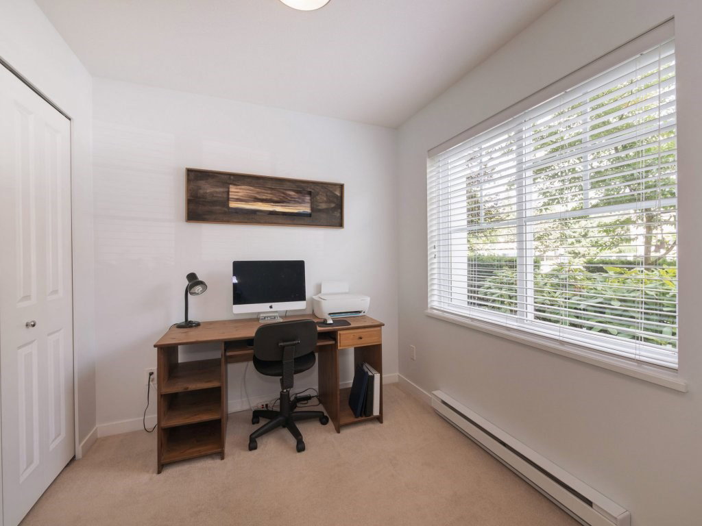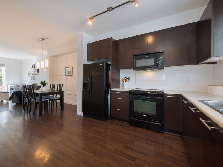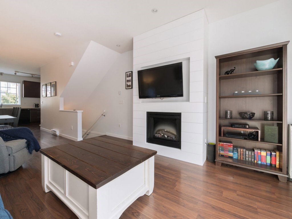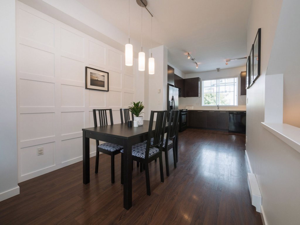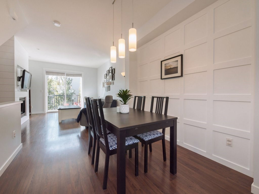 Tate by Mosaic Homes! This bright spacious townhome offers 2 large bedrooms plus den and 2 bathrooms and has been well cared for. Thoughtfully planned layout with 1196 sq.ft of living space! Gorgeous Wainscoting feature wall in large dining area, and new shiplap accent wall in living room. Den off main entrance that could be used as an office and powder room on the same level. Good sized private deck off living room. Nothing to do but move into this great unit that is close to all amenities in a family friendly complex!